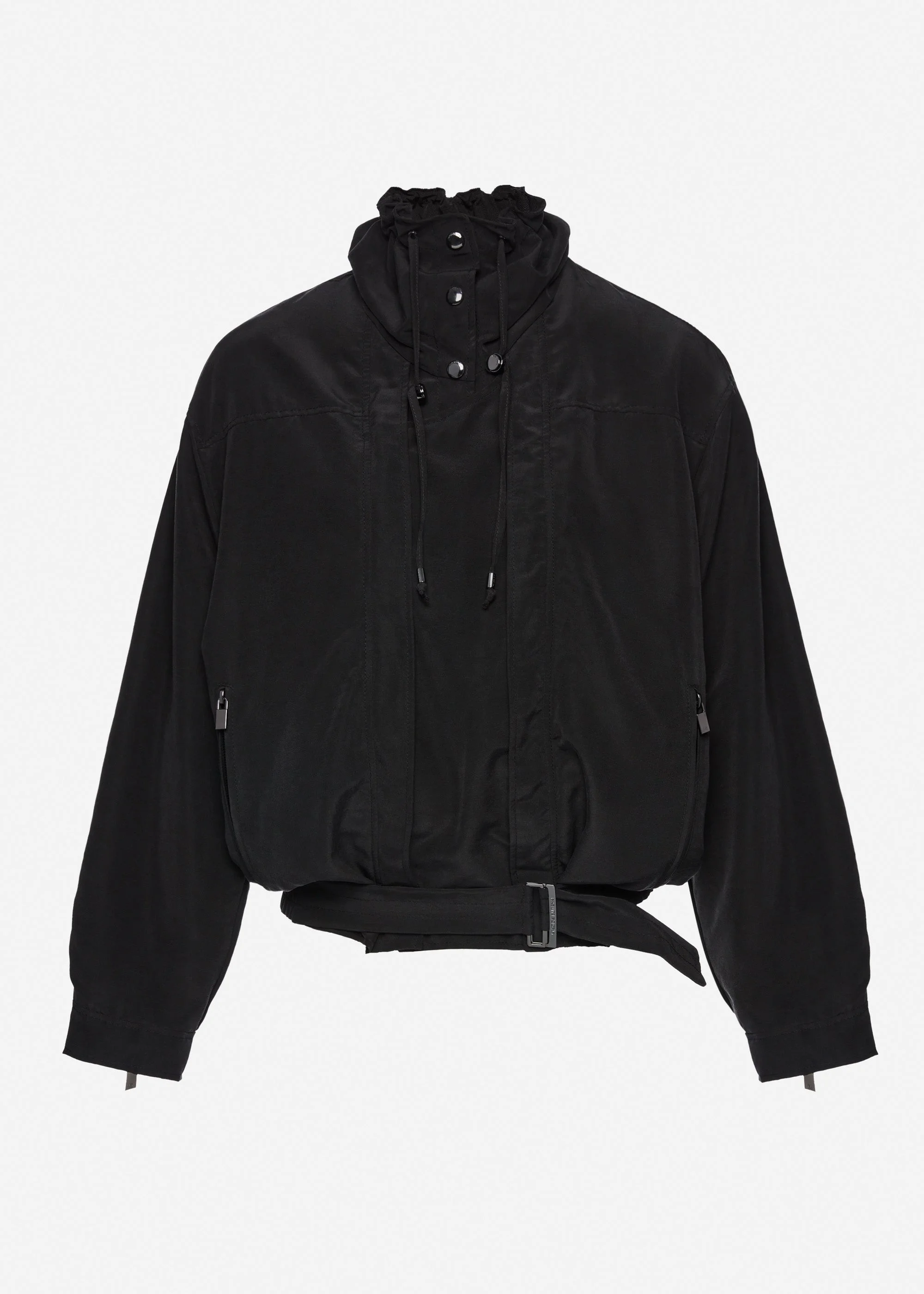 A lightweight bomber jacket crafted from smooth silk with a subtle sheen. Designed with a drawstring high collar and detailed with a tonal embroidered logo across the rear. Features zippered welt pockets, a front zip closure, and an elasticated hem with an additional belt and metal buckle for a defined shape. Finished with an interior buttoned pocket. Details ID: 265426 Shell 100% Silk. Lining 100% Silk. Sizing This piece has a regular fit. Model is wearing a size 34.