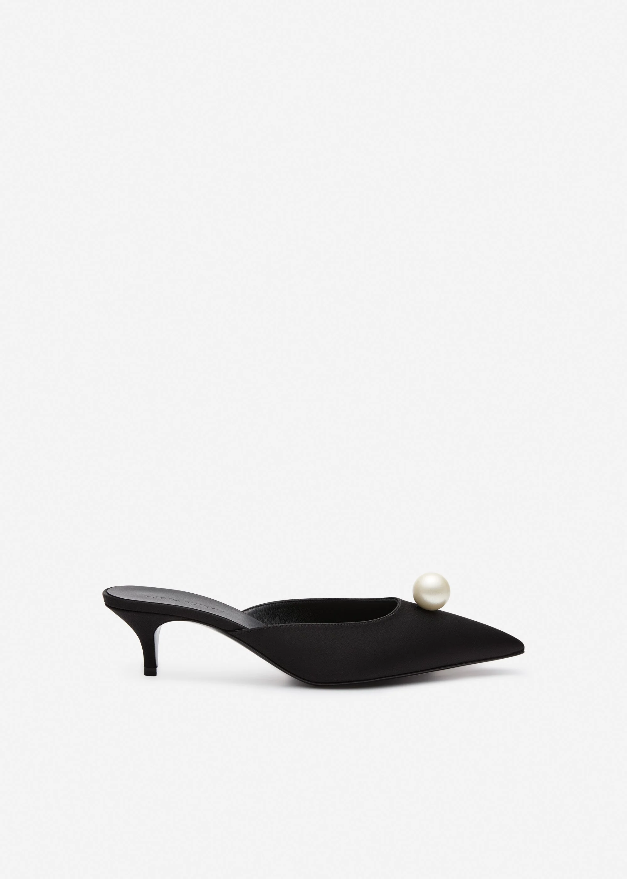 Elegant pointed-toe mules crafted from smooth black satin, defined by a refined kitten heel for subtle elevation. A single oversized pearl embellishment adorns the vamp, adding a sculptural, feminine accent. Heel height is 4,5 cm. Details ID: 513526 Upper: 100% Silk Satin, Insole, Sole: 100% Nappa Leather