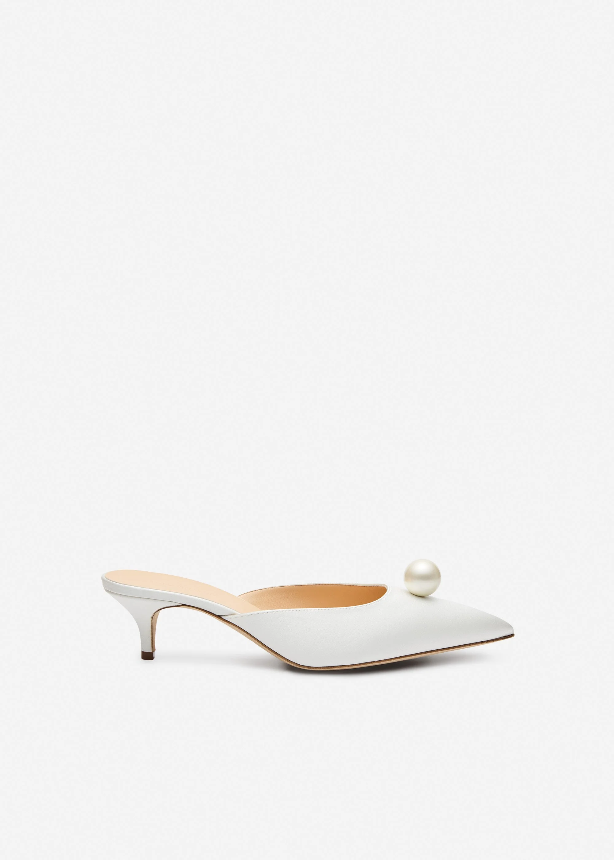 Elegant pointed-toe mules crafted from smooth cream satin, defined by a refined kitten heel for subtle elevation. A single oversized pearl embellishment adorns the vamp, adding a sculptural, feminine accent. Heel height is 4,5 cm. Details ID: 514526 Upper: 100% Silk Satin, Insole, Sole: 100% Nappa Leather