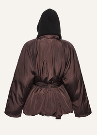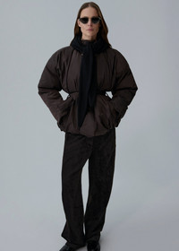 A padded bomber jacket made from nylon with a glossy finish, designed to hit just above the hips. Features a high stand collar, functional belt at the waist, and snap front closure. Two zippered welt pockets are concealed under flaps. The hood in a soft knit fabrication with extended scarf ties is detachable. Finished with tonal lining and light down insulation for warmth. Details ID: 118925 Shell 100% Nylon. Lining 100% Silk. Sizing This piece fits true to size. We recommend you get your regular size. Model is 177 cm and is wearing a size 34.