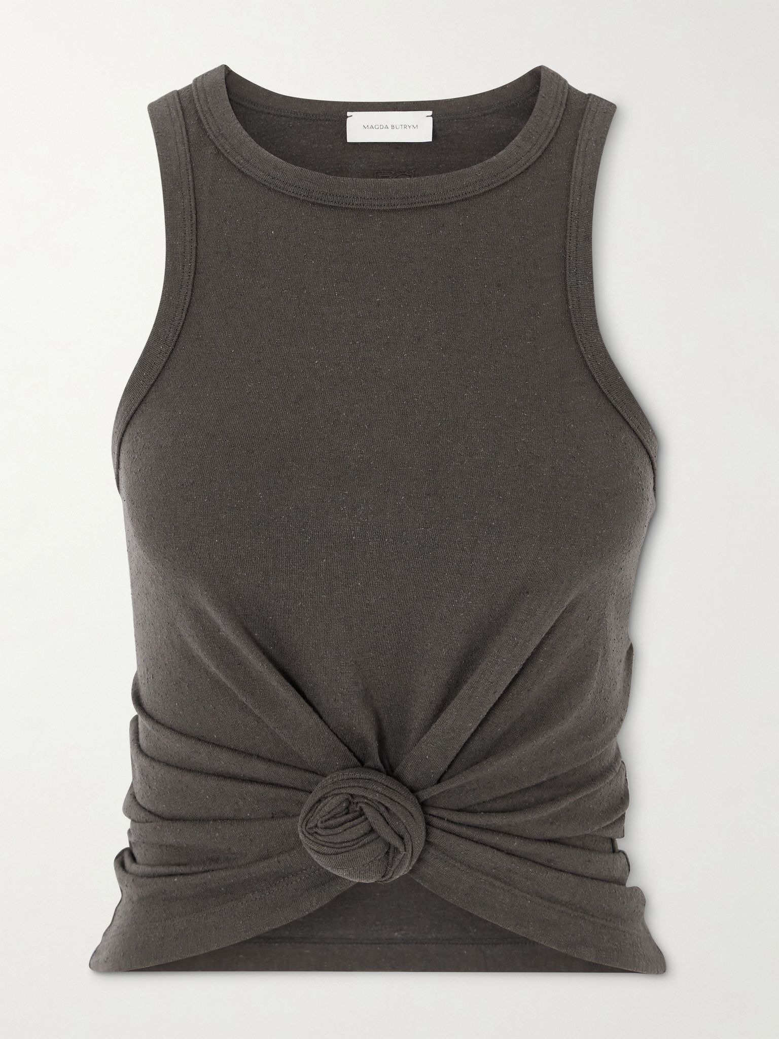 The knot at the front of Magda Butrym's tank is a pretty detail and also a great way to highlight your waist. It's cut from soft cotton and silk-blend for a slim fit and is embroidered with the brand's logo at the back. Wear yours with high-rise jeans or a skirt. Size & Fit - Fits true to size, take your normal size - Designed for a slim fit - Lightweight, non-stretchy fabric - Model is 177cm/ 5'10" and is wearing a FR 36 Model measurements: - Bust: 85cm/ 33.5" - Waist: 65cm/ 25.5" - Hip: 91cm/ 36" Details & Care - Mushroom melange cotton and silk-blend - Slips on - 75% cotton, 25% silk - Hand wash