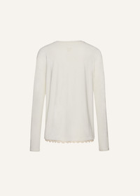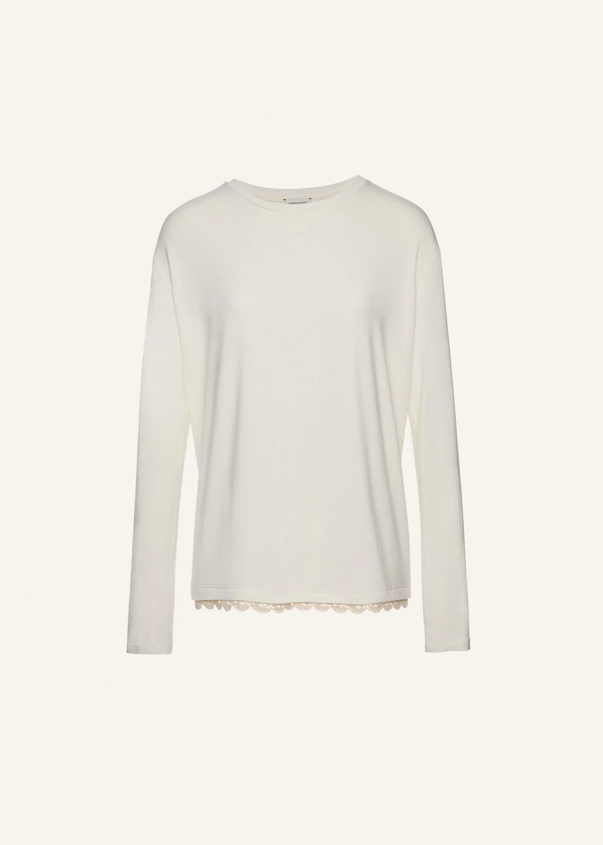 A long sleeve cotton tshirt with the brand's signature handmade lace crochet detailing at the hem, a round neckline and loose fit. Details ID: 208725 Shell 95% Circulose 5% Elastane Sizing This piece fits true to size. We recommend you get your regular size. Model is 180 cm and is wearing a size 34.