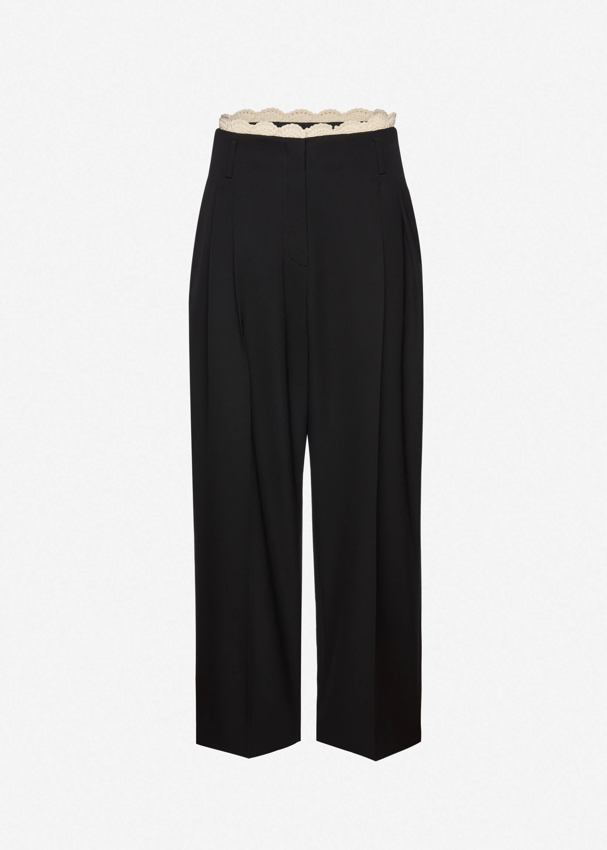 These tapered trousers have an updated, more relaxed fit for a casual feel. Finished with Magda Butrym's signature handmade lace crochet detailing at the waistline. Details ID: 187526 Shell 100% Wool Lining 100% Silk Sizing This piece has an oversized fit. Model is wearing a size 34.