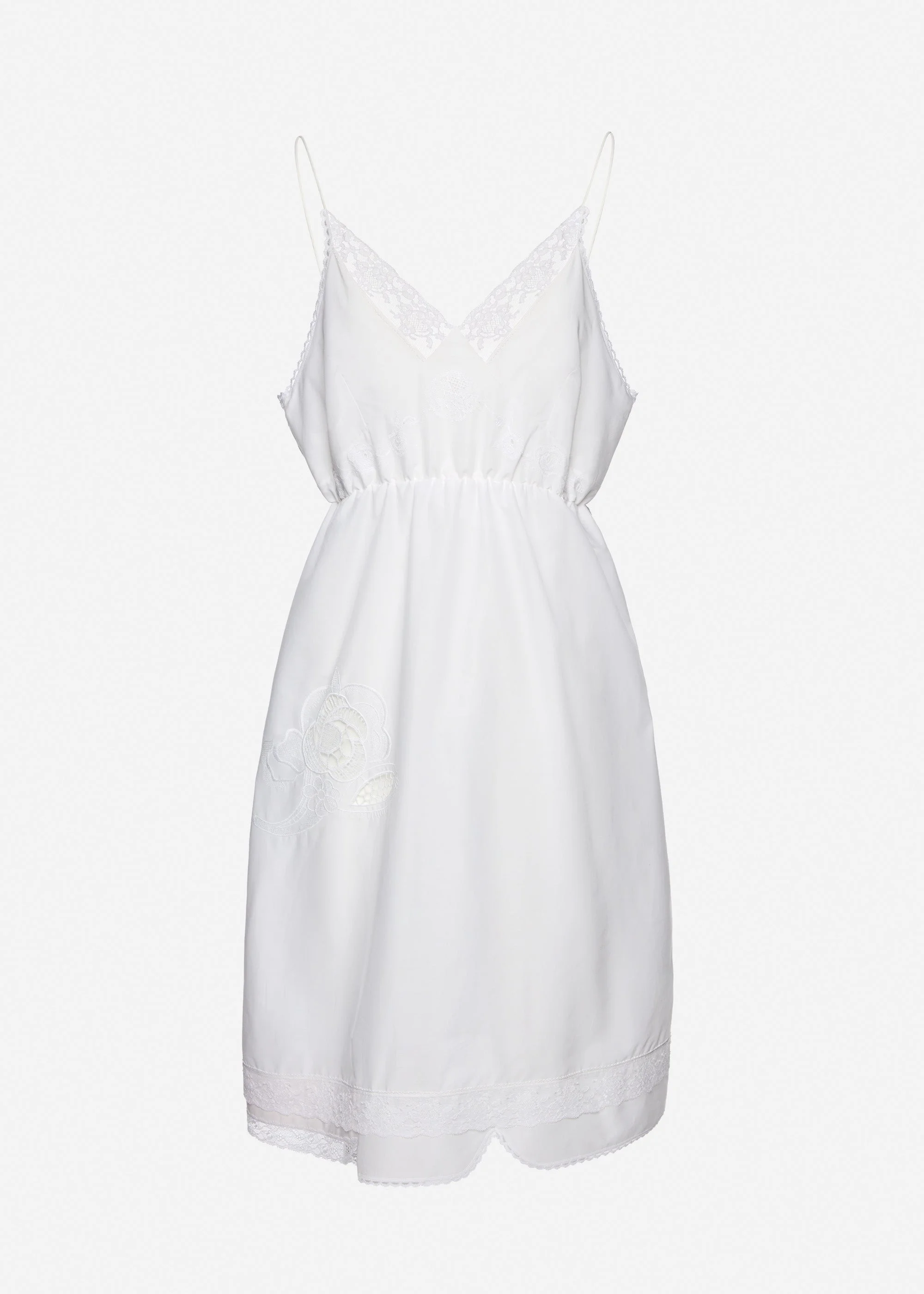 A fluid midi slip dress crafted from lightweight cotton. Designed with delicate thin straps and a feminine V-shaped neckline at the front, it features lace inserts that continue along the armholes and back neckline for a refined lingerie-inspired finish. The front hem is asymmetrically shaped with a decorative contrast insert, while each panel and seam is finished with ornate lace trim for added texture and depth. Slips on easily over the head. Details ID: 159526 Shell 40% Silk 30% Wool 20% Cotton 10% Polyester Lining 100% Cotton Sizing This piece has a regular fit. Model is wearing a size 34.