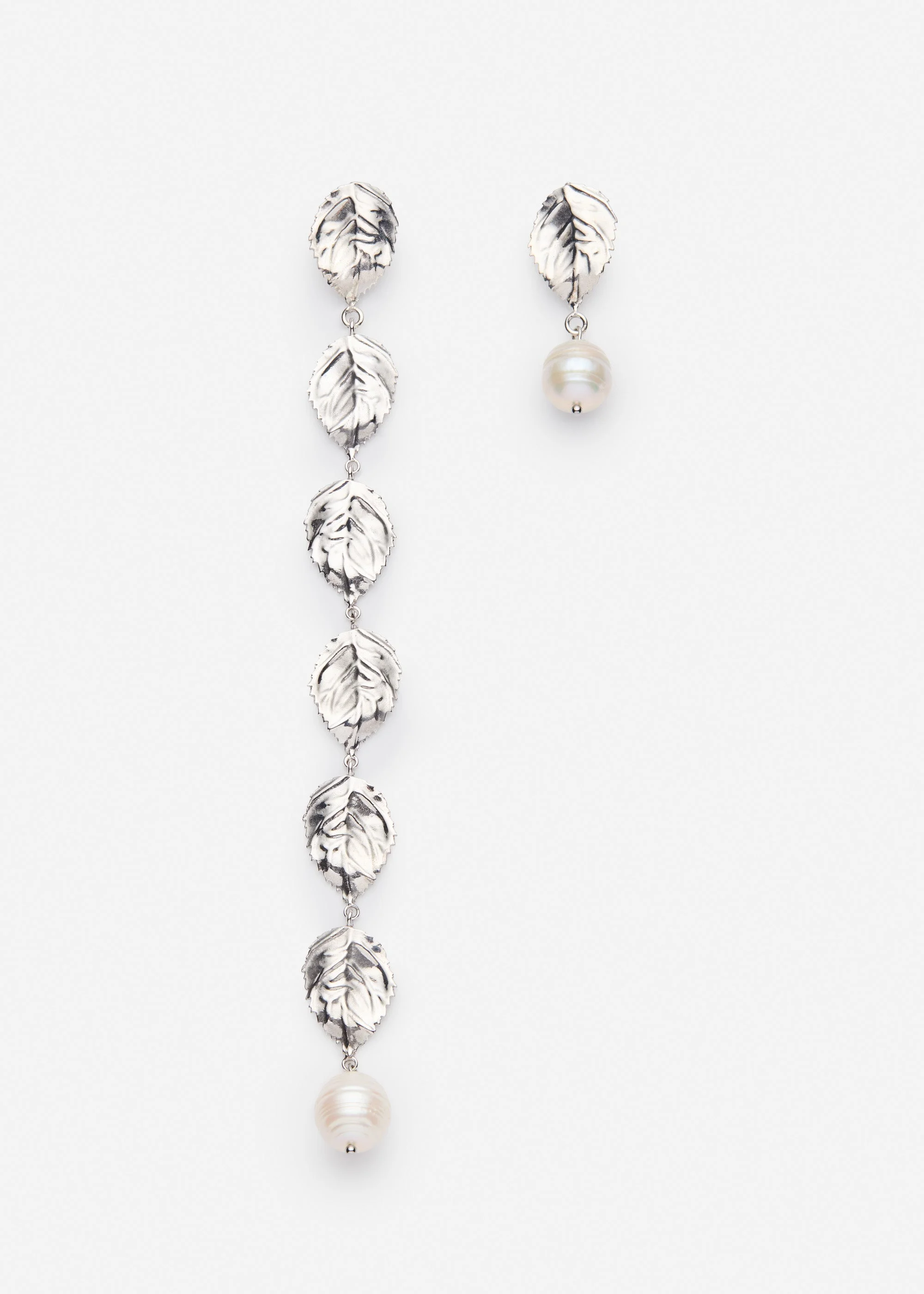 An elegant asymmetric pair crafted in silver-tone metal, featuring sculpted leaves cascading into a single baroque pearl drop. One earring extends in a long, articulated vine for a dramatic effect, while the other remains minimal with a single pearl accent. For pierced ears. Details ID: 708426 Hypoallergenic Plated Brass. Freshwater Cultured Pearls.