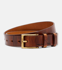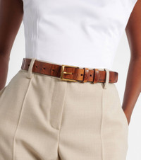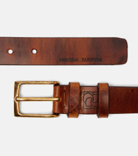 This leather belt by Magda Butrym is made unique for its natural and antiqued texture that enhances its vintage charm. The design is complete with a gold-toned buckle that makes it a versatile and timeless piece. Product Details - Material: leather - Lining: leather - Made in Poland - Designer color name: Brown - Item color: brown - Hardware color: antique gold - Closure: buckle fastening - Item number: P01074896 Size & Fit - Width 2,9cm-1" - Buckle width 3,6cm-1.5" - Min. length 74cm-29" - Max. length 92cm-36"