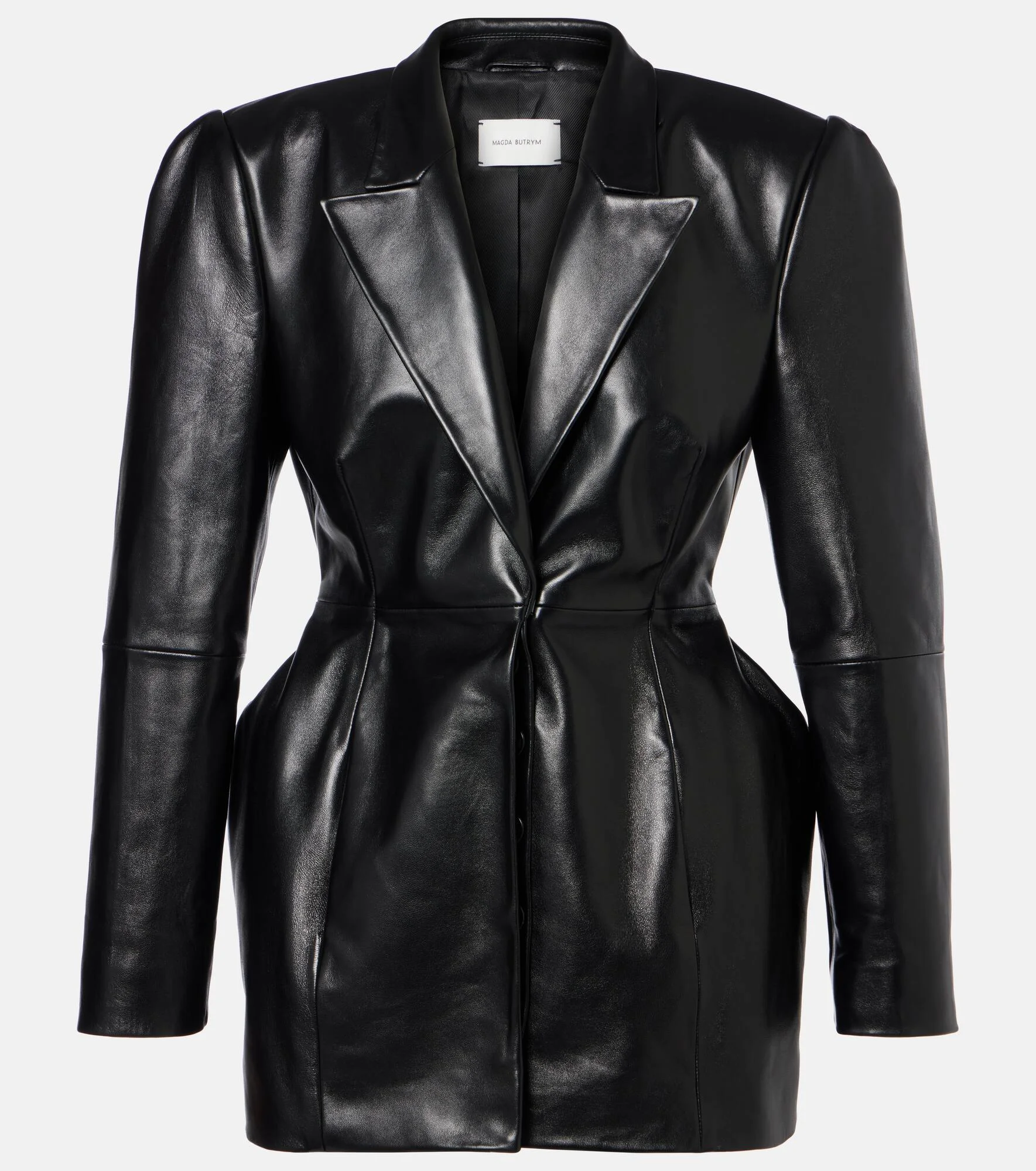 Magda Butrym aims to empower with sharp modern style, expertly delivered through artisanal excellence. Made in Poland from leather, this blazer is a single-breasted piece with shoulder pads and a slightly exaggerated hourglass design. Product Details - Material: 100% sheep leather - Care instructions: dry clean - Made in Poland - Color: black - Designer color name: Black - Lining: 100% viscose - Closure: concealed buttoned front - Item number: P01130902 Size & Fit - True to size - Oversized shoulders - Cinched waist - Non-stretchy fabric - Falls below the hip - The model seen in the picture is 178cm-5'10" and wearing a size FR 36