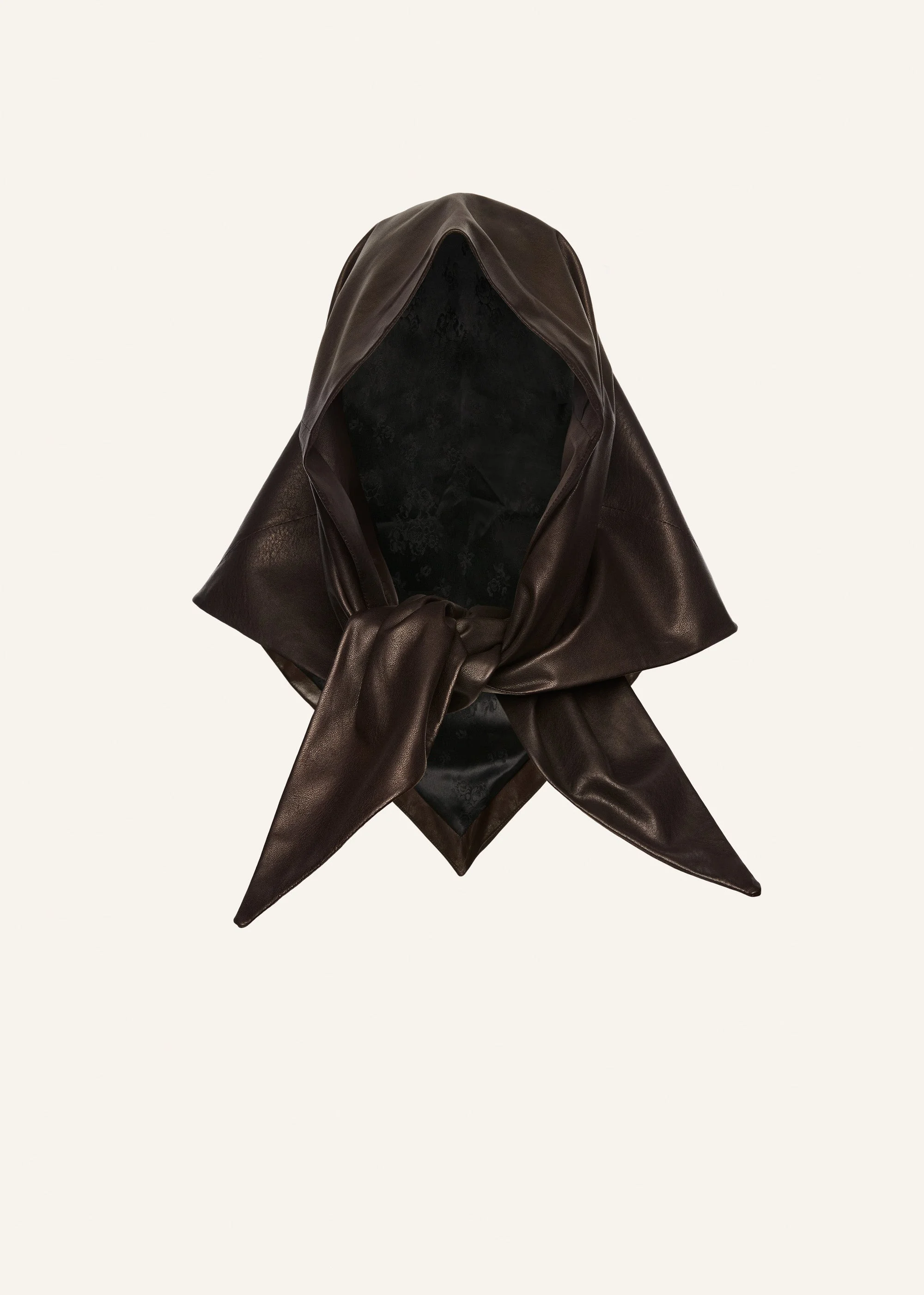 A triangle-shaped leather scarf designed to bring a modern edge to any outfit. The smooth, soft leather drapes effortlessly, and the elongated ends allow for a stylish tie under the chin. This scarf makes a statement while paying homage to timeless headwear traditions. Details ID: 369725 Shell 100% Sheep Leather. Sizing Approximate measurements: 85 cm x 85 cm x 120 cm