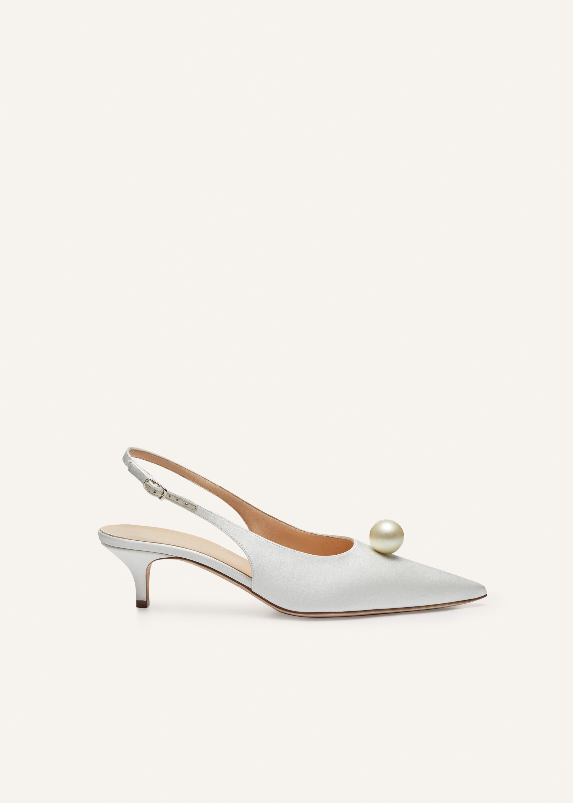 Classic pointed-toe slingback kitten heels with a pearl embellishment at the front. Set on a 45mm heel. Made in Italy. Details ID: 520425 Upper: Satin (100% Silk). Insole, Sole: 100% Calf Leather Sizing This piece fits true to size. We recommend you get your regular size.