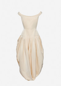 An elegant off-shoulder gown that combines a fitted bodice with sculptural draping. Crafted from cotton and silk. The upper silhouette is precisely tailored with contouring darts to accentuate the waist, while the wide neckline softly frames the shoulders. Below the hips, the voluminous skirt unfolds in asymmetric pleats and rounded side drapes. Finished with discreet side pockets, a concealed back zip, and a fully lined bodice for structure and comfort—modern romance with timeless couture refinement. Details ID: 268426 Shell 51% Cotton 49% Silk Lining 100% Silk Sizing This piece has a slim fit. Model is wearing a size 34.