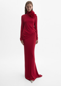 An elegant long dress crafted from soft viscose-silk jersey with a hint of stretch. Features long raglan sleeves and a draped blouson top that contrasts with a fluid, body-skimming skirt. The front is modestly cut with a high collar, while the back reveals an open design for a striking finish. The collar fastens at the back with five buttons. Comes with a detachable flower brooch. Details ID: 330426 Shell 81% Viscose 15% Silk 4% Elastane Sizing This piece has a regular fit. Model is wearing a size 34.