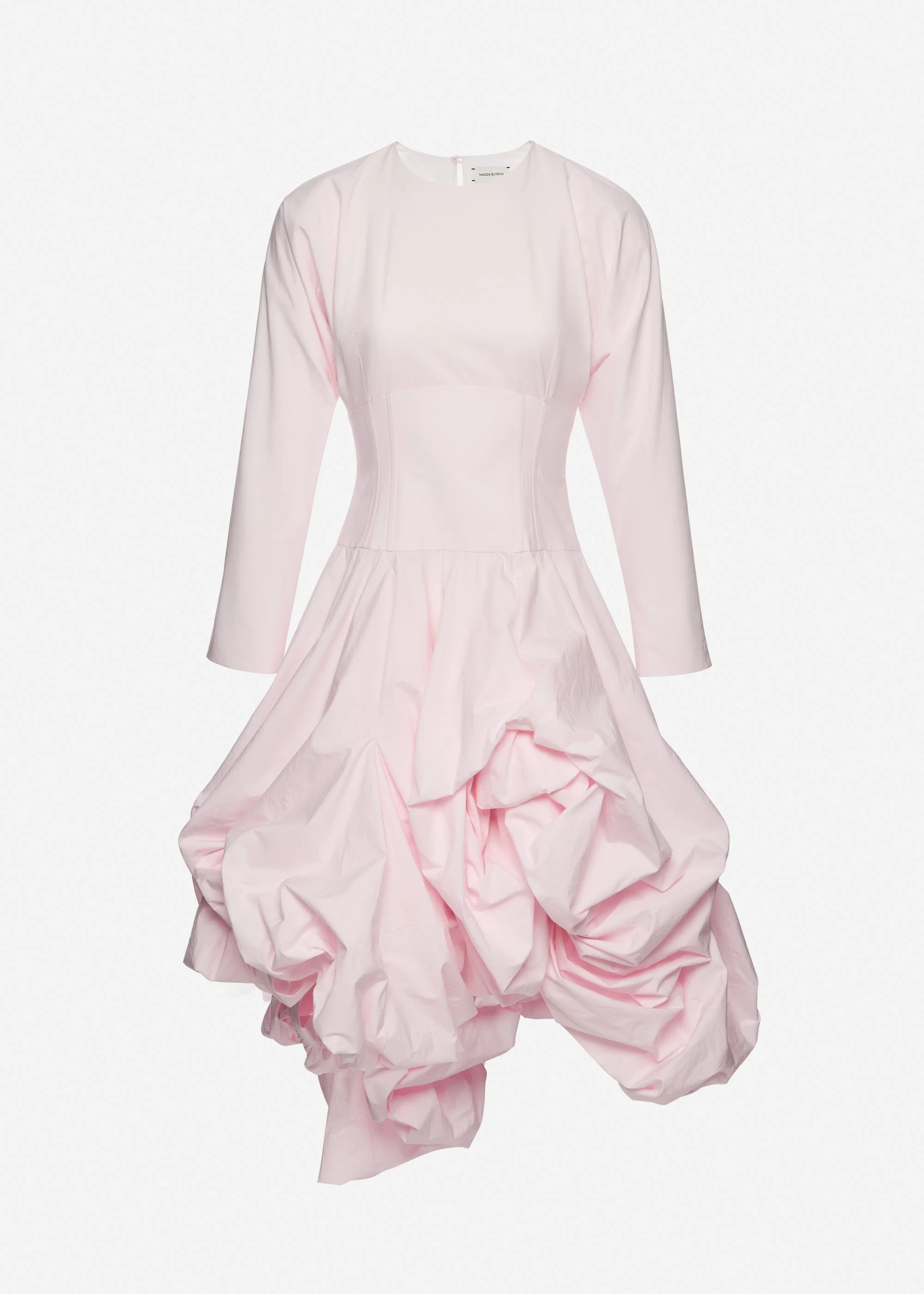 A long-sleeve dress crafted from crisp cotton, combining precise structure with dramatic volume. The bodice features a small round neckline and elongated kimono sleeves. The skirt is densely gathered to create a bold, voluminous shape, finished with discreet side-seam pockets. Hidden buttons sewn into the inner seams allow the hem to be artfully pinned and adjusted into varied, sculptural forms. Finished with a concealed center-back zip. Details ID: 335526 Shell 100% Cotton. Sizing This piece has a slim fit. Model is wearing a size 34.