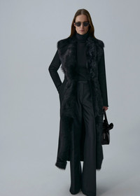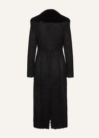 Long tailored coat in supple black shearling leather, featuring plush fur trim along the collar and front opening. Details ID: 171925 Shell 100% Sheep Leather. Sizing This piece fits true to size. We recommend you get your regular size. Model is 177 cm and is wearing a size 34.