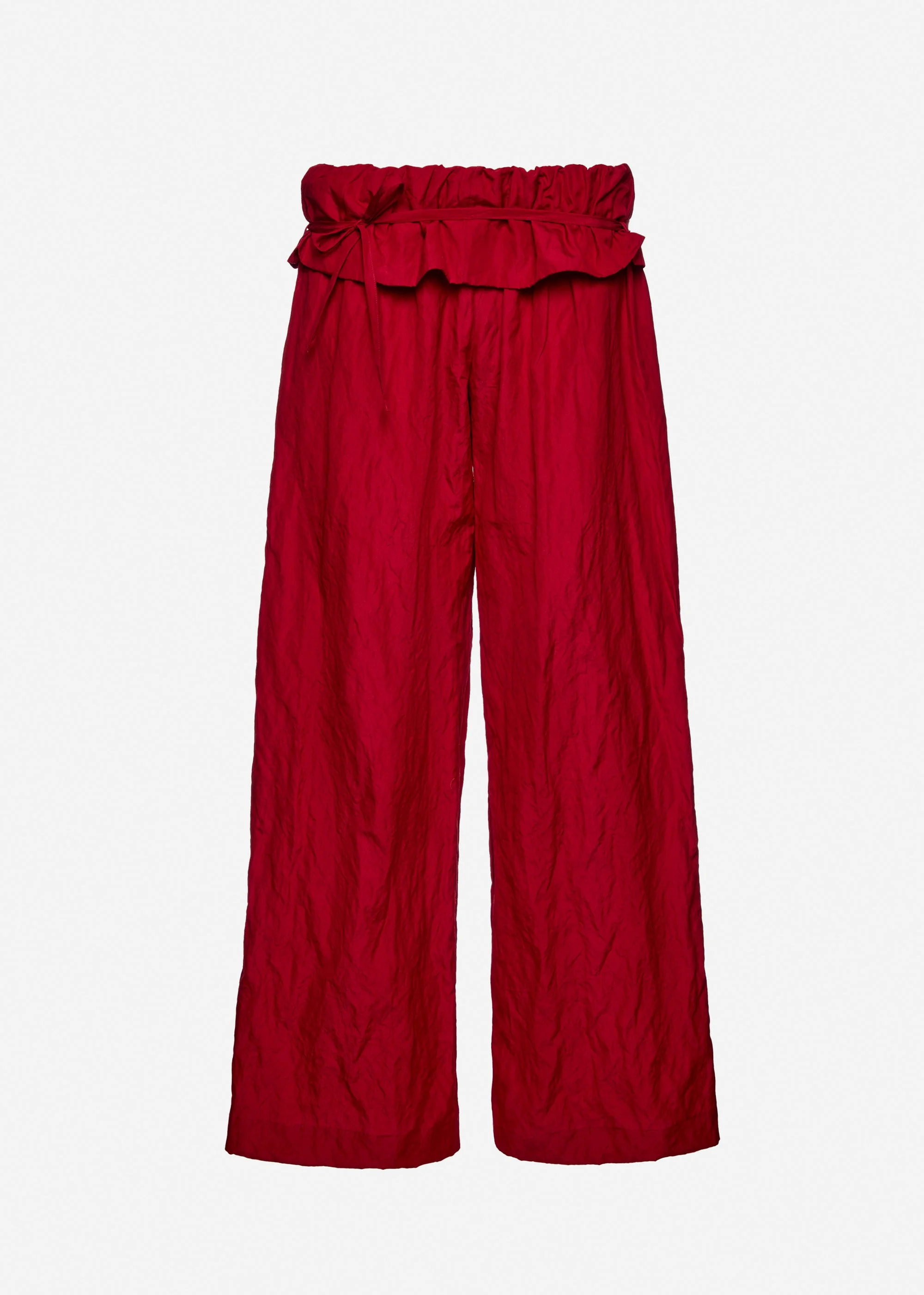 Long trousers designed with a relaxed, straight leg and a subtly lowered waist. The silhouette is defined by a high ruffled waistband that sits above the hips, introducing soft volume. A slim, detachable tie threaded through belt loops allows for adjustable, decorative tying at the waist. Finished with discreet side seam pockets. Details ID: 165526 Shell 90% Cotton 10% Metallic