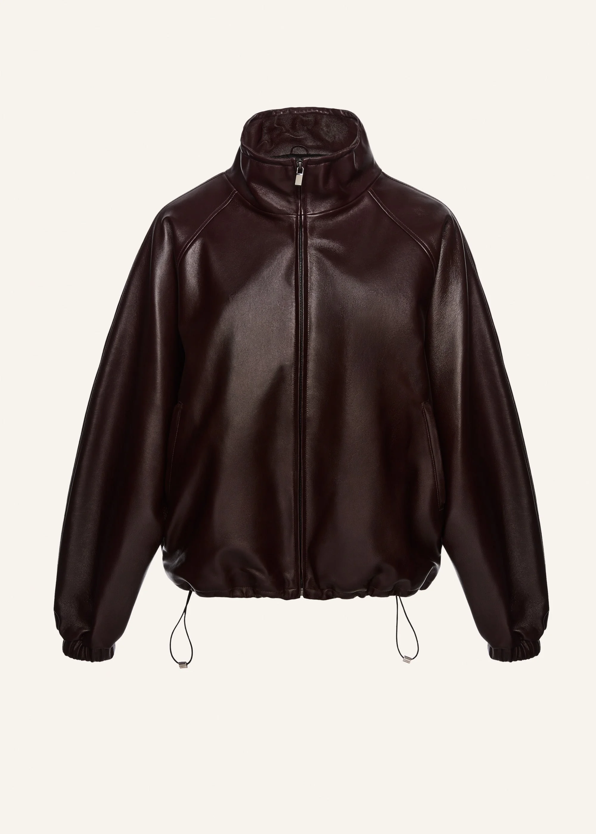 Elasticized leather bomber jacket in burgundy