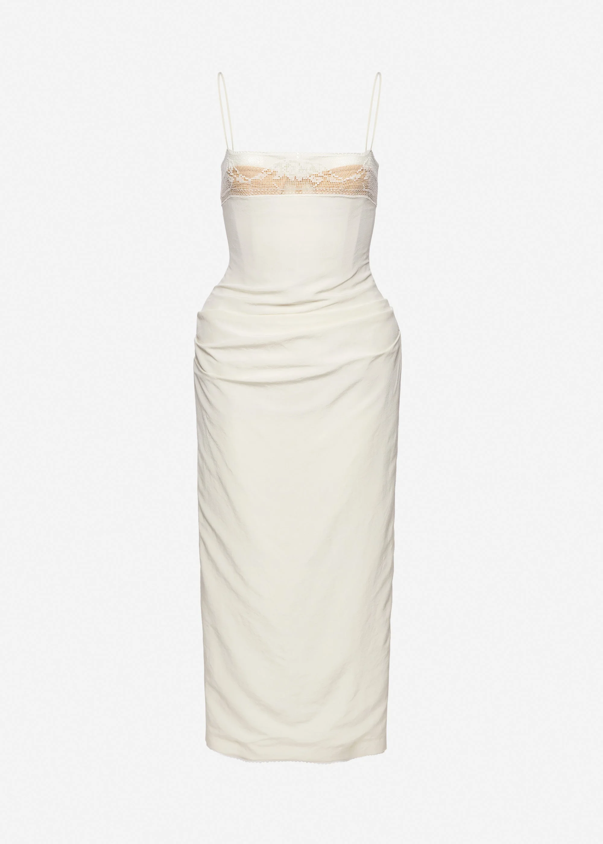 A mid-length fitted dress crafted from lightly crinkled silk. Features thin shoulder straps and a straight neckline trimmed with delicate lace. A built-in corset provides structure and is subtly visible through the lace panel at the front. The silhouette is softly draped with side and back gathers, accentuating the shape. The hips are enhanced with internal padding. Fastens at the back with a concealed zipper and a slit for ease of movement. The inner hem is detailed with a silk placket edged in fine lace. Details ID: 166426 Shell 100% Silk. Sizing This piece has a slim fit. Model is wearing a size 34.