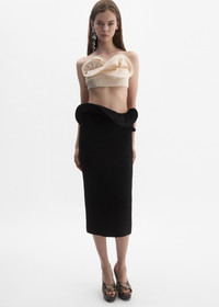 A mid-calf pencil skirt featuring a lowered waistline, finished with decorative overlays. On the right front, a sculptural, hand-twisted flower detail adds an artisanal touch. The skirt fastens with a concealed zip at the center back, finished with a subtle slit for movement. Details ID: 176426 Shell 90% Viscose 10% Polyamide. Lining 100% Silk Sizing This piece has a regular fit. Model is wearing a size 34.