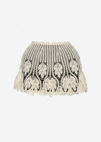 A silk mini skirt featuring a contrasting crochet overlay crafted from cotton. Designed with a clean waistband and softly rounded hips supported by subtle padding for structure. The hem is finished with decorative lace detailing that adds texture and depth. Fully lined. Details ID: 286426 Shell 100% Cotton Lining 100% Silk Sizing This piece has a slim fit. Model is wearing a size 34.