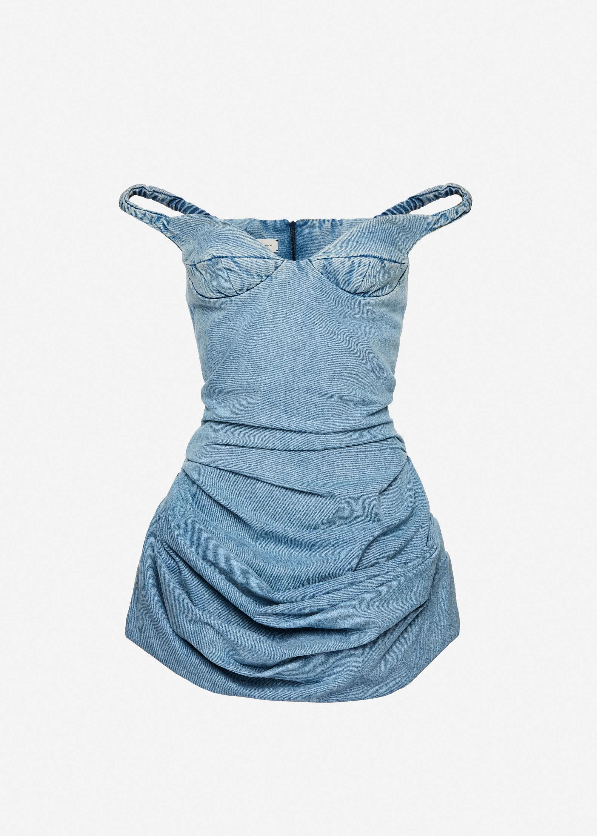 A denim mini dress defined by a softly draped neckline and an expressive, gathered skirt. The fitted bodice shapes the silhouette while the rounded neckline creates a bold, architectural frame for the shoulders. Finished with a concealed zip closure at the back. Details ID: 180526 Shell 100% Cotton Sizing This piece has a slim fit. Model is wearing a size 34.