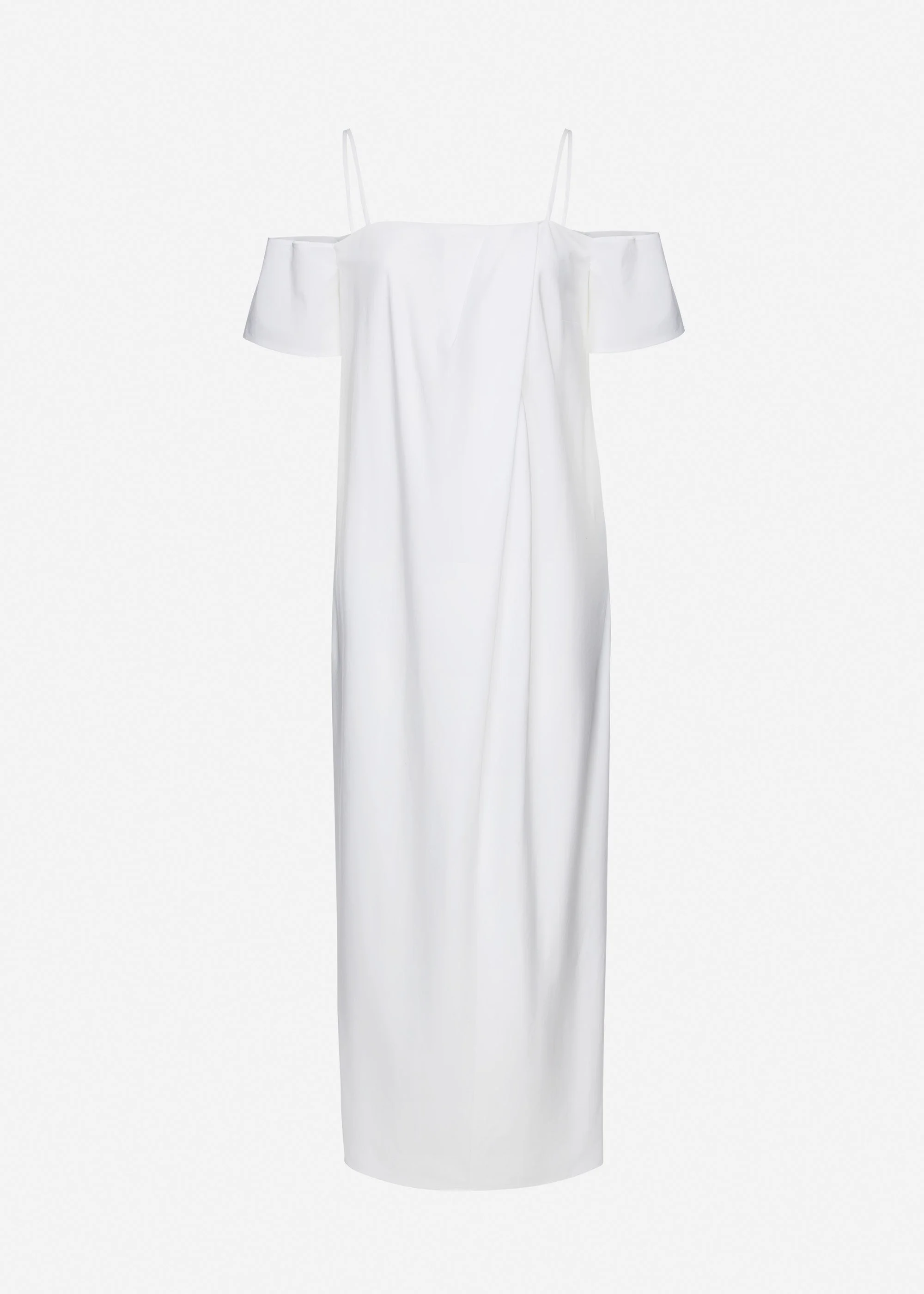 A minimalist long dress crafted from pure cotton, defined by a clean, elongated silhouette. Designed with a straight neckline and slender shoulder straps, it features softly dropped off-shoulder sleeves secured with elasticated bands for comfort and ease of movement. Discreet side-seam pockets add functional elegance, while the fully lined construction ensures a smooth, refined drape. Finished with a concealed center-back zip and a back slit below the closure for effortless wear. Details ID: 230526 Shell 100% Cotton. Sizing This piece has a regular fit. Model is wearing a size 34.