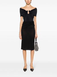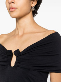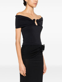off-shoulder cropped blouse Highlights - Black - Crepe texture - Floral applique - Prong detail at the neck - Off-shoulder - Draped shawl detailing - Straight hem Imported Composition Polyamide 85%, Spandex/Elastane 15% SIZE & FIT Model measurements Height 5 ft 11 in(1.8 m) Bust/Chest 35.03 in(89 cm) Hips 35.03 in(89 cm) Waist 23.62 in(60 cm) FittingInformation Designed for a close fit throughout Cropped in length Made from a lightweight stretch fabric, this piece offers elasticity and flexibility when worn This piece fits true to size – take your usual size