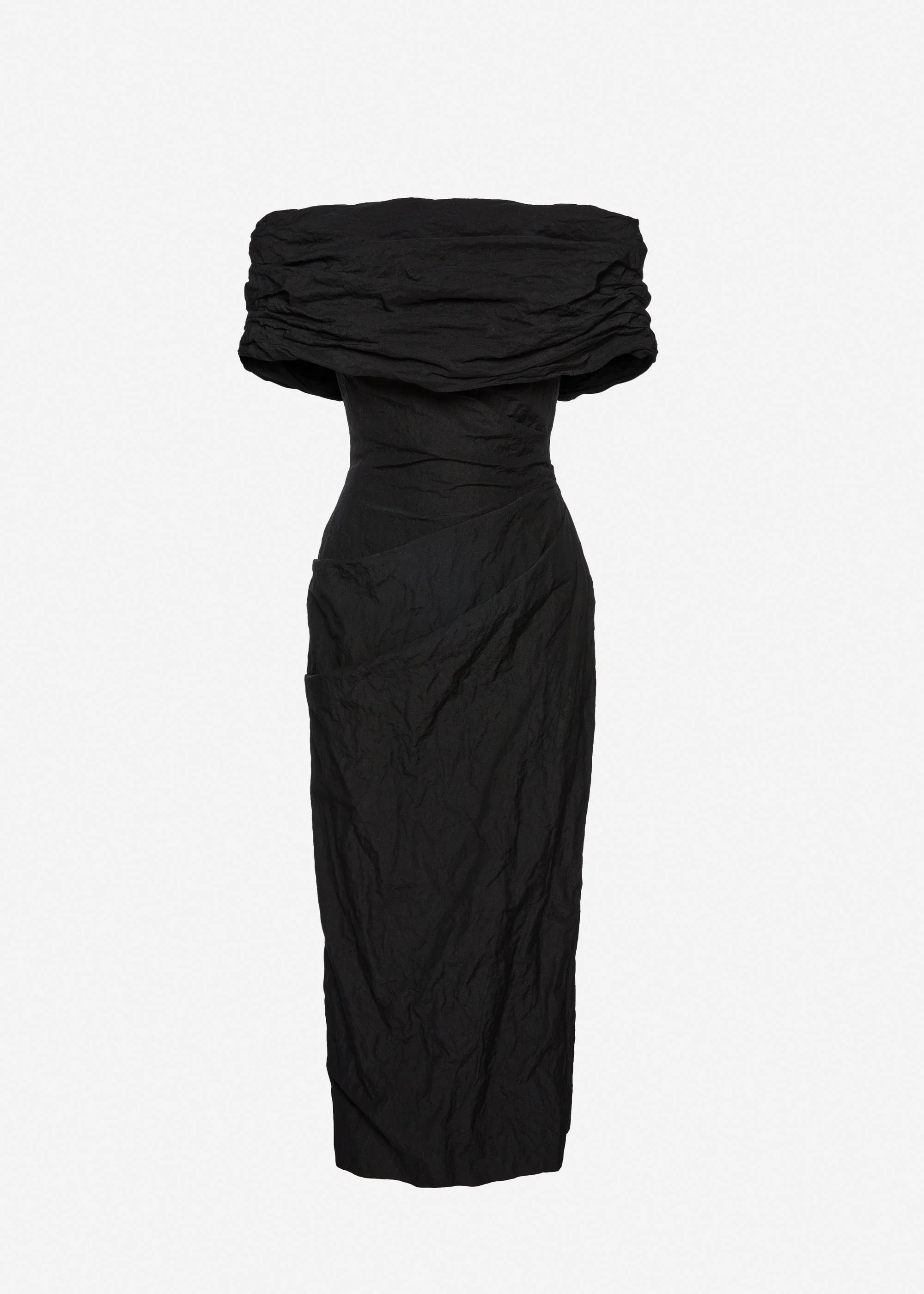 Off-shoulder draped midi dress in black