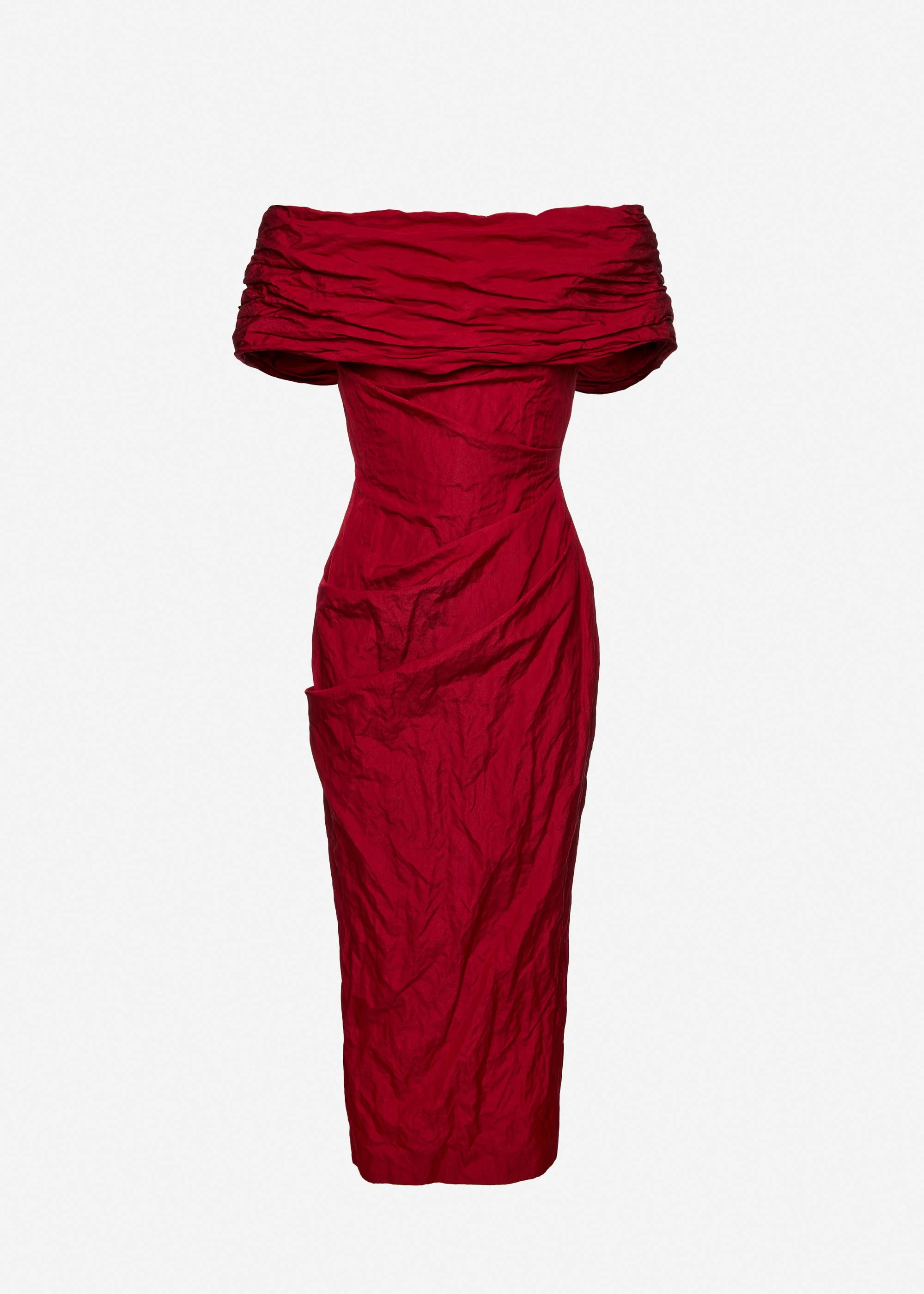 Designed with a wide neckline framed by an oversized, sculpturally draped collar that falls softly over the upper arms, it creates a dramatic shawl-like effect. The straps are discreetly secured underneath with an elasticated band, ensuring stability while maintaining an off-shoulder appearance. The back is deeply cut. Finished with a concealed center-back zip and a long slit below. Details ID: 225526 Shell 90% Cotton 10% Metallic. Lining 100% Silk. Sizing This piece has a slim fit. Model is wearing a size 34.