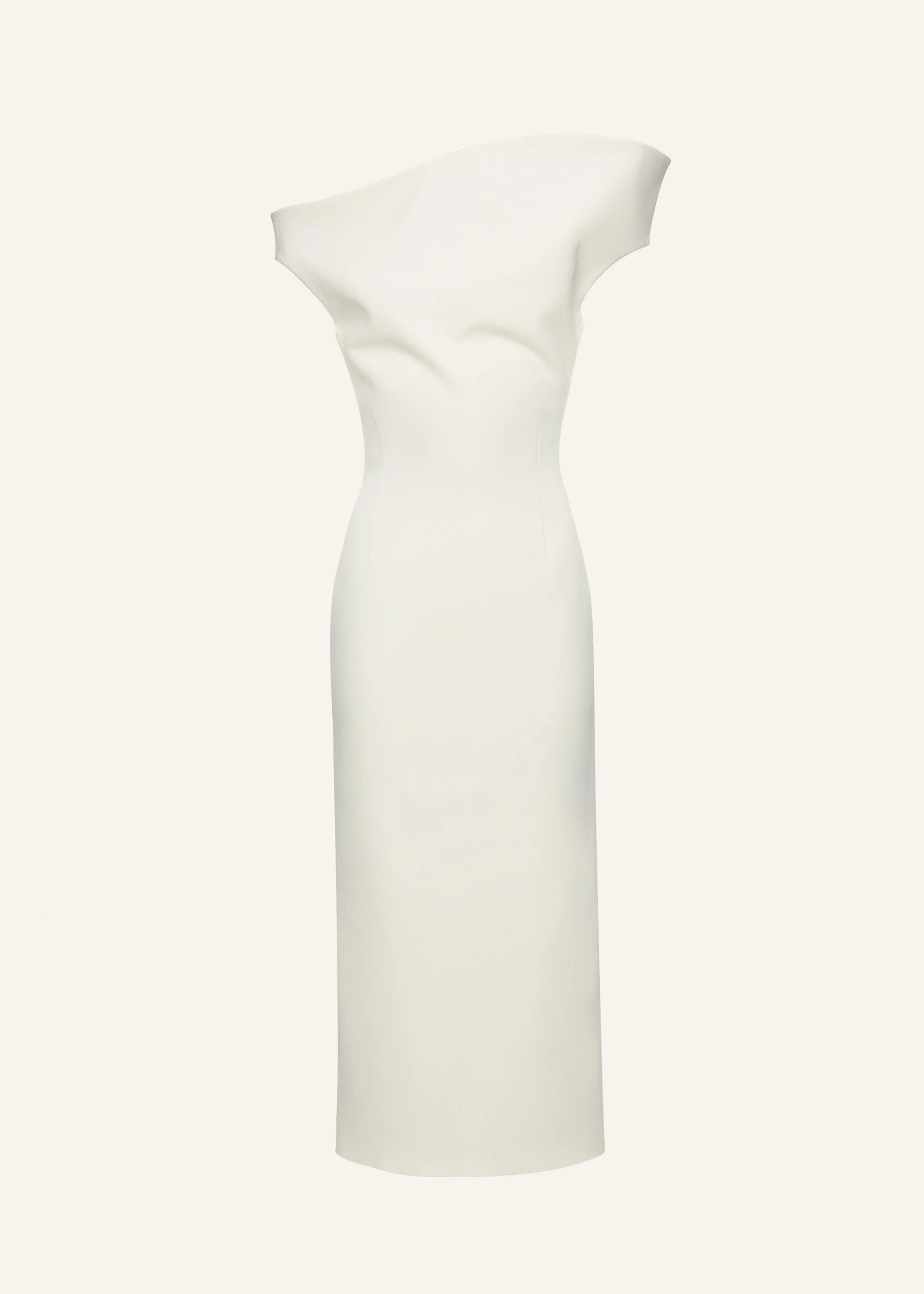 A minimalist yet striking silhouette defined by its sculptural neckline and clean tailoring. This ankle-length dress features a wide, elevated off-shoulder neckline that delicately frames the collarbone and shoulders. Fitted through the waist and hips, the bodice is reinforced with side boning for structure and support. The concealed back zip closure ensures a smooth fit, while a back slit allows ease of movement. Fully lined for comfort and a flawless finish. Details ID: 225925 Shell 78% Viscose 16% Polyamide 6% Elastane Sizing This piece fits true to size. We recommend you get your regular size. Model is 177 cm and is wearing a size 34.