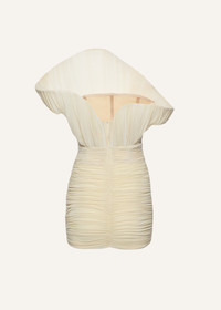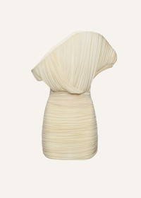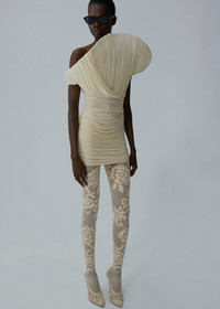 A standout piece of the collection, this sculptural mini dress features a dramatic fan-like draped front that flows into a one-shoulder silhouette. Crafted with Magda Butrym’s signature gathered detailing, the body-hugging fit is created through intricate ruching across the torso and hips. A bold yet elegant evening option that captures the essence of the brand’s modern femininity. Details ID: 210925 Shell 92% Cupro 8% Elastane. Sizing This piece fits true to size. We recommend you get your regular size. Model is 177 cm and is wearing a size 34.