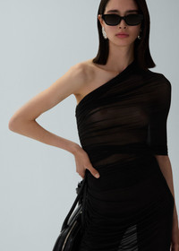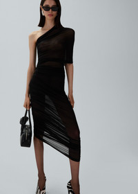 Black sheer silk midi dress with one-shoulder styling and single sleeve, paired with a matching bodysuit. Details ID: 245425 Shell 92% Cupro 8% Elastane. Sizing This piece fits true to size. We recommend you get your regular size. Model is 180 cm and is wearing a size 34.