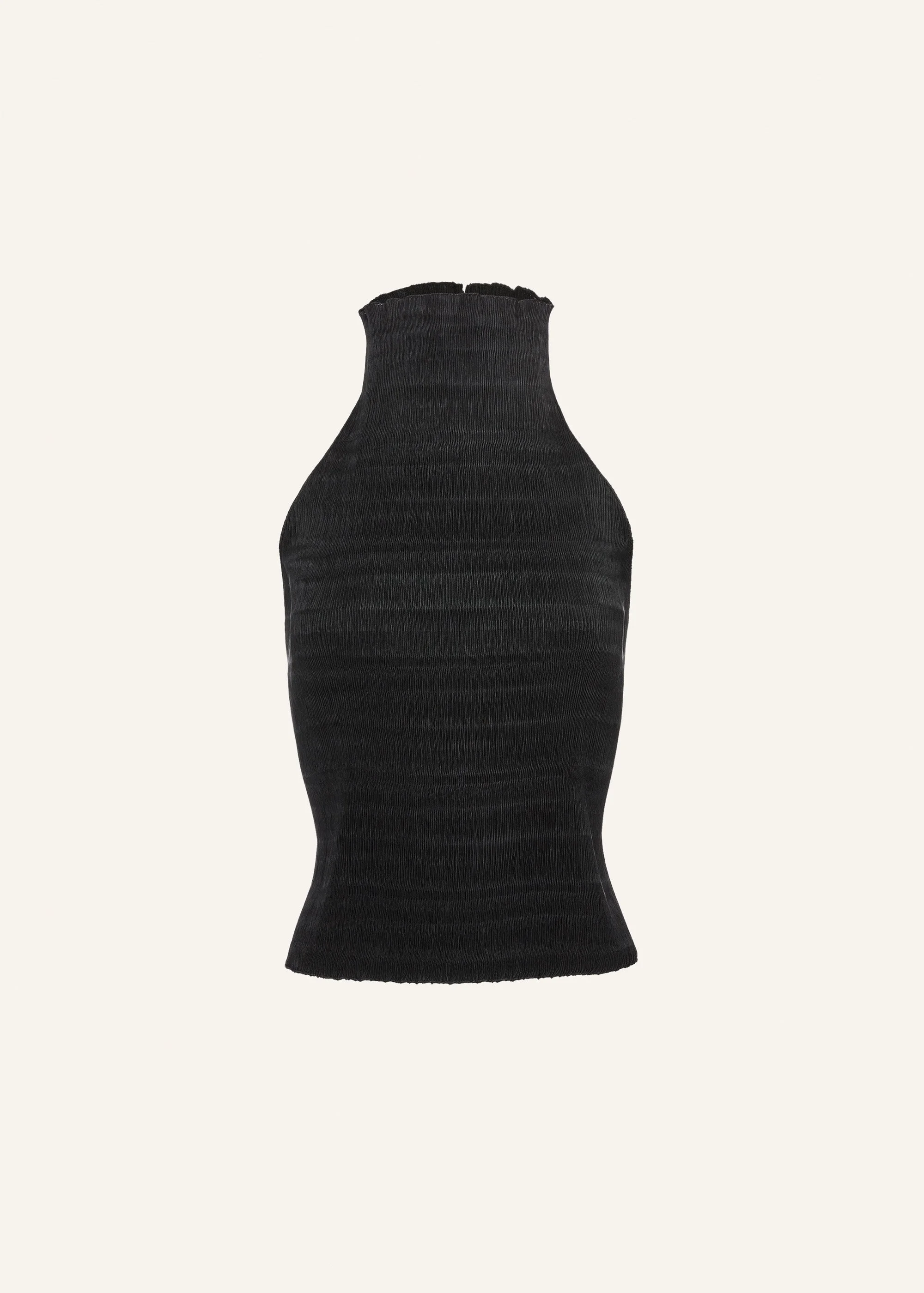 Halter top made from fine plisse fabric. It features an open back and a high neckline finished with a narrow stand collar. The collar fastens at the back with fabric-covered buttons. Designed to be slipped on over the head, this piece offers a sleek silhouette with rich texture and modern minimalism. Details ID: 224925 Shell 100% Polyester Lining 90% Silk 10% Elastane Sizing This piece fits true to size. We recommend you get your regular size. Model is 177 cm and is wearing a size 34.