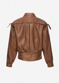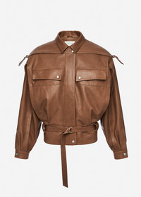 An oversized leather jacket defined by its relaxed silhouette and utilitarian details. Features shoulder straps with adjustable buckles, flap chest pockets with snap buttons, and a front closure concealed under a placket. The waist is cinched with a matching belt, while the back features a subtle embossed logo. Details ID: 124426 Shell 100% Sheep Leather Lining 100% Viscose Sizing This piece has a regular fit. Model is wearing a size 34.