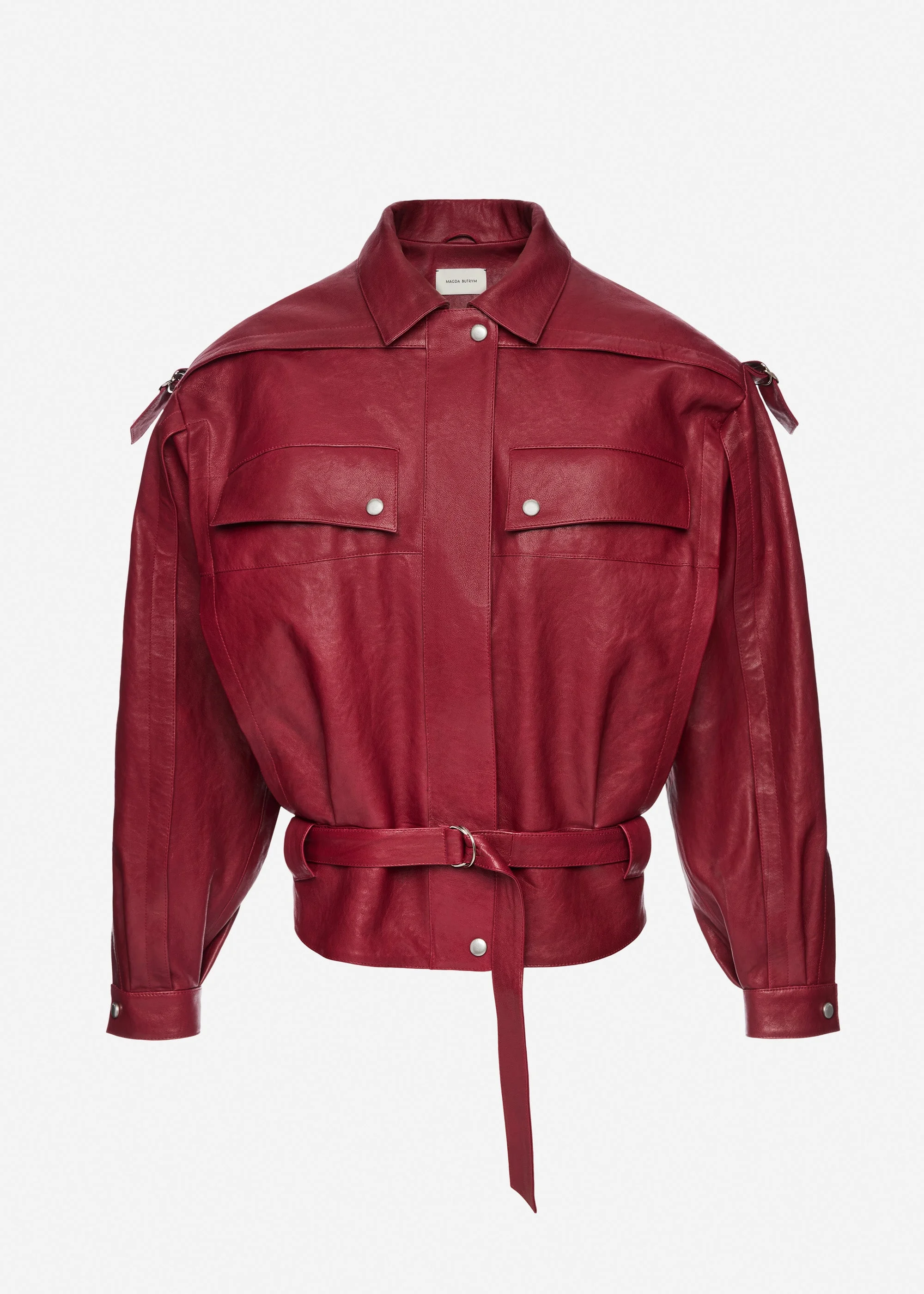 Oversized belted leather jacket in cherry red