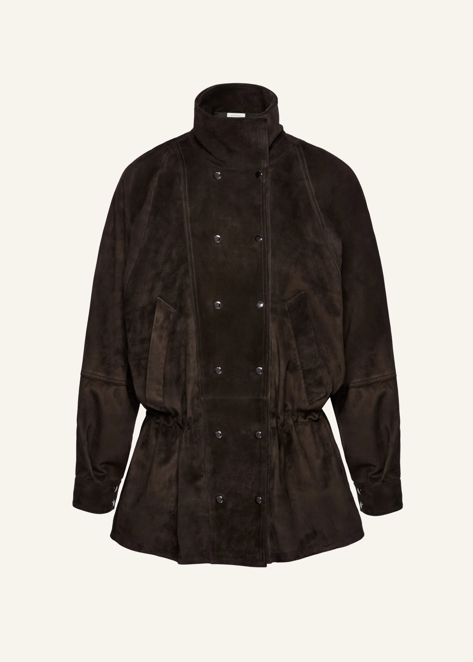 A longline jacket, cut from supple suede, with a cinched waist for a peplum effect. The jacket features a double snap button closure and a foldable high neck. Details ID: 514525 Shell 100% Sheep Leather. Lining 100% Viscose. Sizing This piece fits true to size. We recommend you get your regular size. Model is 178cm and is wearing a size 34.