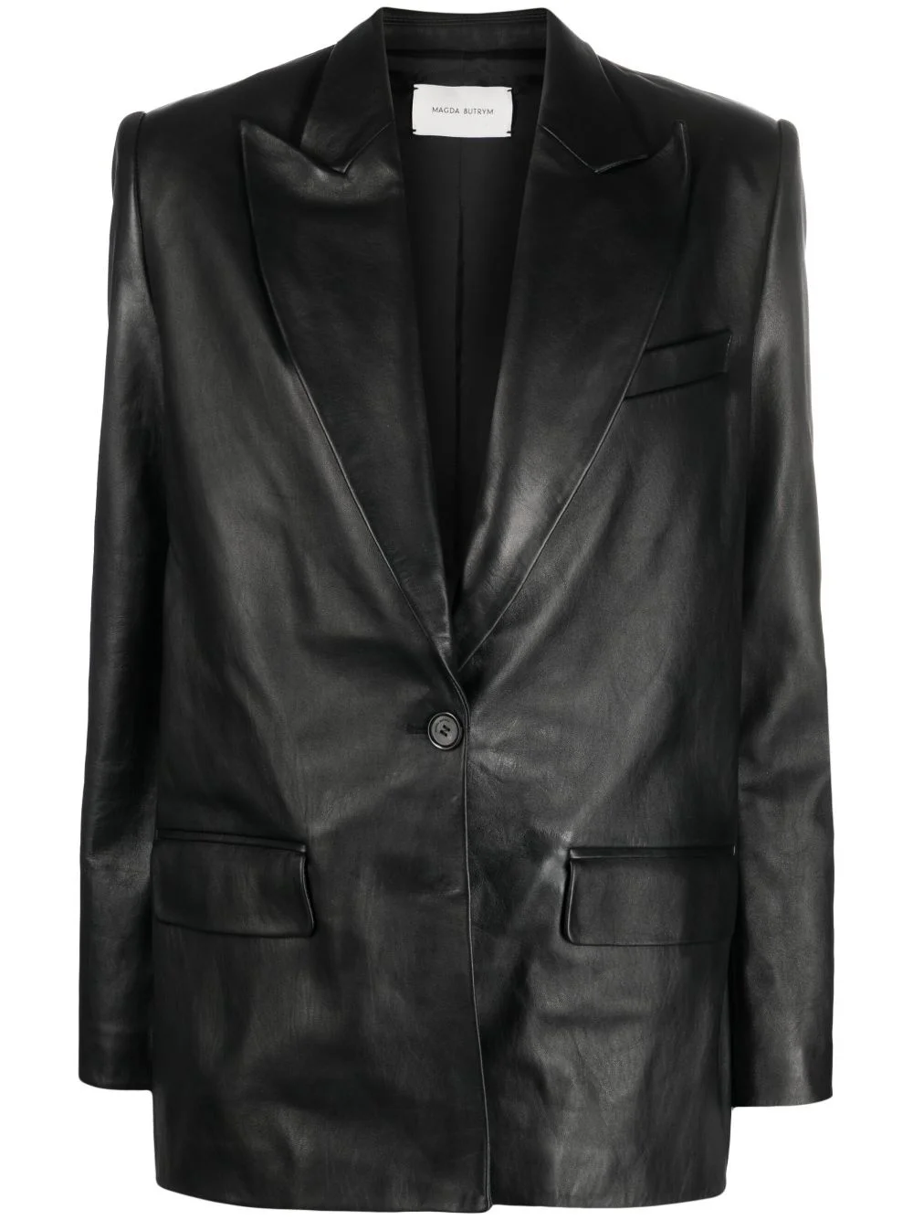 peak-lapels sheepskin blazer For AW23, Magda Butrym introduces a contemporary alternative to the classic blazer with this sheepskin iteration. Its wide peak lapels and relaxed cut add boldness to the look. Highlights - Black - Sheepskin - Wide peak lapels - Front button fastening - Long sleeves - Buttoned cuffs - Straight hem Imported Composition Outer: Sheepskin 100% Lining: Viscose 100% SIZE & FIT Model measurements Height 5 ft 10 in(1.77 m) Bust/Chest 32.67 in(83 cm) Hips 35.43 in(90 cm) Waist 23.62 in(60 cm) FittingInformation Designed to be unstructured, offering a loose fit throughout The internal shoulder pads offer a structured shape Firm leather offering little flexibility to maintain its durability and sturdiness This piece fits true to size – take your usual size
