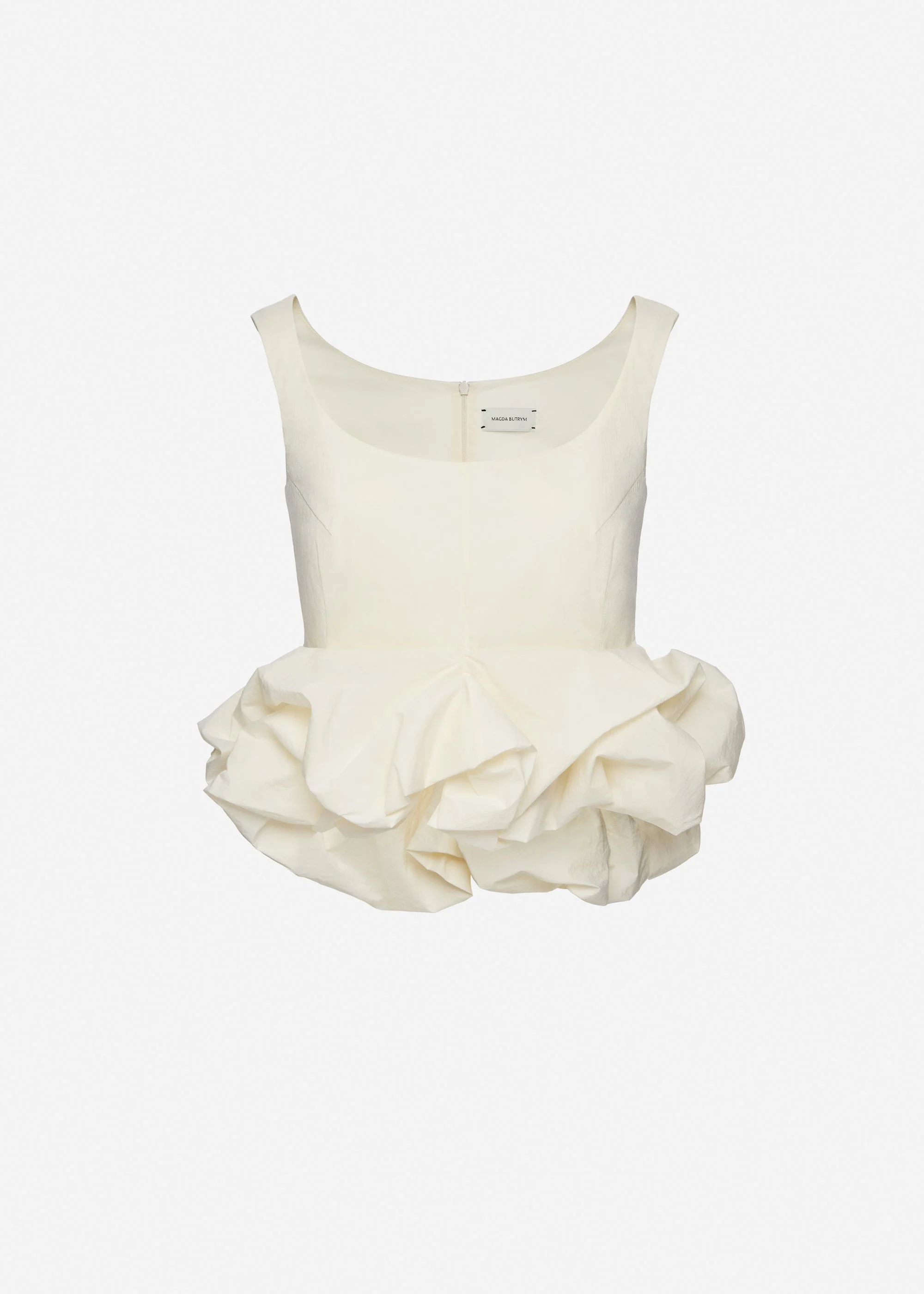 Pre-order: expected to ship by March 30th 2026 A sleeveless blouse with wide straps and a softly scooped neckline. Fitted through the waist with dart detailing, the silhouette flares out into a voluminous peplum created by tightly gathered fabric folds. Finished with a concealed zip closure at the back and a delicate lace-trimmed interior waistband. Details ID: 134526 Shell 55% Polyester Recycled 45% Polyester Sizing This piece fits true to size. We recommend you get your regular size.