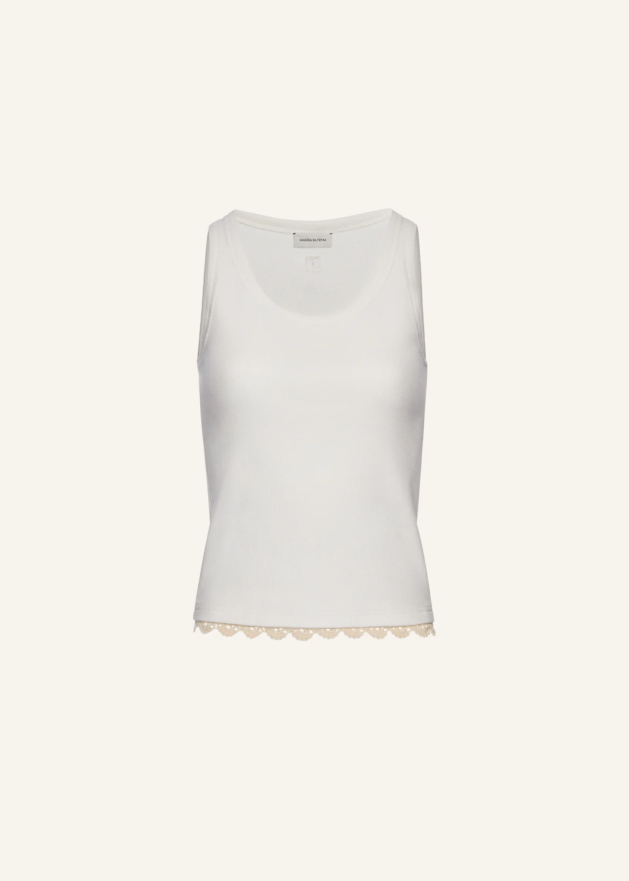 A simple cotton tank top featuring Magda Butrym's signature handmade lace crochet detailing at the hem. Details ID: 179725 Shell 95% Cotton 5% Elastane. Trim 100% Cotton. Sizing This piece fits true to size. We recommend you get your regular size. Model is 180 cm and is wearing a size 34.