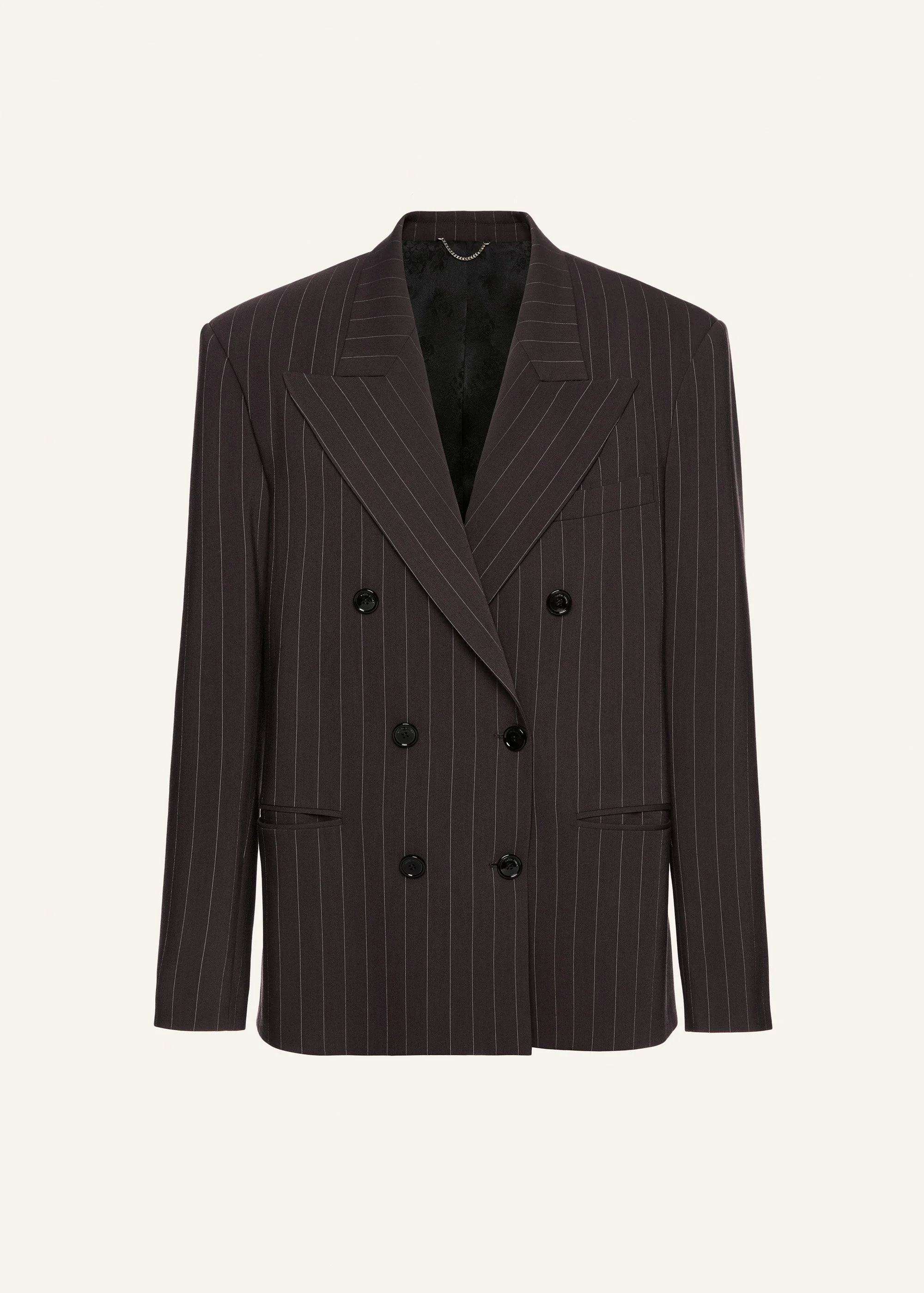 A classic double-breasted blazer with sharp tailoring and an oversized silhouette, crafted in a rich espresso hue with fine vertical pinstripes. Strong shoulders and elongated lapels elevate the masculine-inspired cut, while subtle waist shaping softens the structure for a refined and modern finish. Details ID: 107925 Shell 97% Wool 3% Polyamide. Lining 100% Silk. Sizing This piece fits true to size. We recommend you get your regular size. Model is 177 cm and is wearing a size 34.