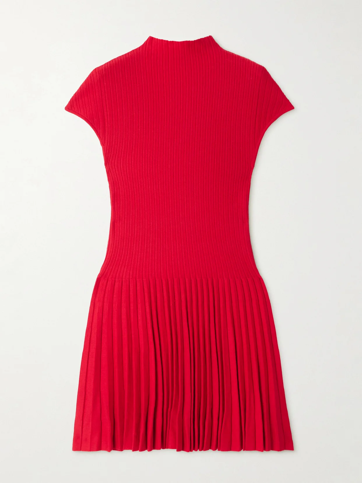 Magda Butrym's mini dress is striking in color and shape. Made from bold red cotton, it's knitted with a ribbed finish through the fitted bodice and falls to a pleated skirt that moves as you walk. The mock neckline and cap sleeves offer a chic, sophisticated look.