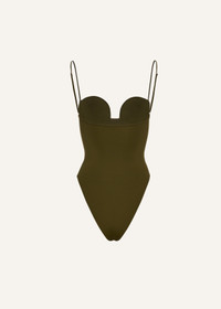 This swimsuit, part of Magda's very first swimwear collection, is now presented in dark green. Featuring the signature retro bustier silhouette, it embodies the brand's iconic aesthetic. Details ID: 801725 Shell 82% Polyamide 18% Elastane. Sizing This piece fits true to size. We recommend you get your regular size. Model is 180 cm and is wearing a size 34.