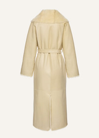 A full-length coat crafted from shearling, designed to be worn on either side. One side reveals a plush shearling surface with soft texture and volume, while the reverse showcases smooth leather with subtle seam detailing. The generous shawl collar, wide sleeves, and self-tie belt create a sculptural silhouette that drapes effortlessly. Details ID: 351925 Shell 100% Sheep Leather. Sizing This piece fits true to size. We recommend you get your regular size. Model is 177 cm and is wearing a size 34.
