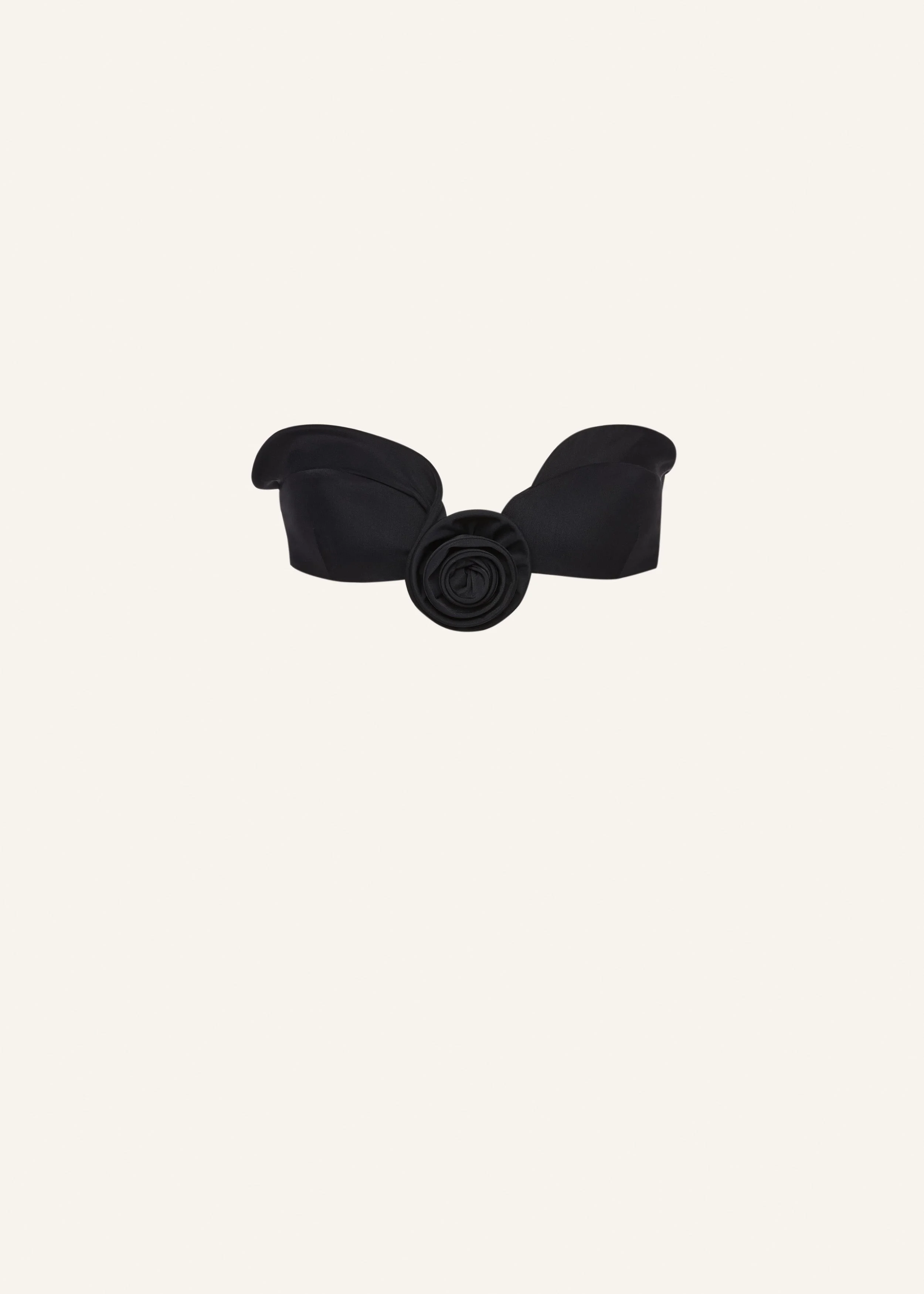 An elegant black bandeau swim top featuring a sculptural design and adorned with a standout rose-shaped centerpiece for a touch of romance. Pairs beautifully with matching or contrasting swim bottoms for a refined, chic look. Details ID: 822725 Shell 75% Polyamide 25% Elastane. Sizing This piece fits true to size. We recommend you get your regular size. Model is 180 cm and is wearing a size 34.