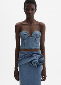This denim midi skirt, crafted from dark blue denim, features a signature Magda Butrym touch — a hand-folded denim rose applique at the hip. The design is completed with a back slit for ease of movement and a concealed zip closure at the center back. Details ID: 147426 Shell 100% Cotton. Sizing This piece has a regular fit. Model is wearing a size 34.