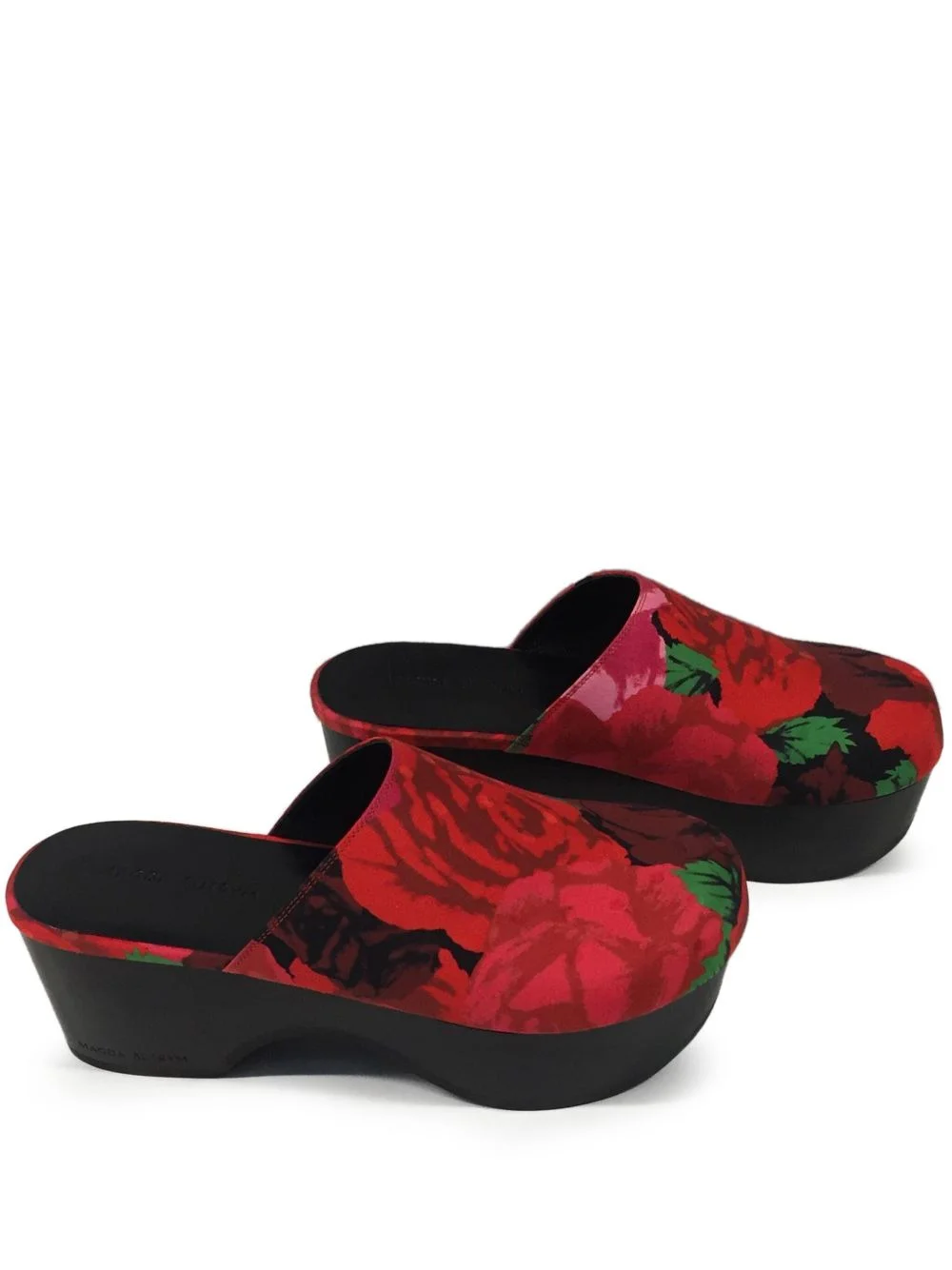 rose-print platform mules Highlights - Red - Rose print - Platform sole - Wedge heel - Slip-on style Made in Italy Composition Sole: Rubber 100% Outer: Silk 100% Lining: Leather 100%