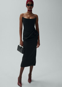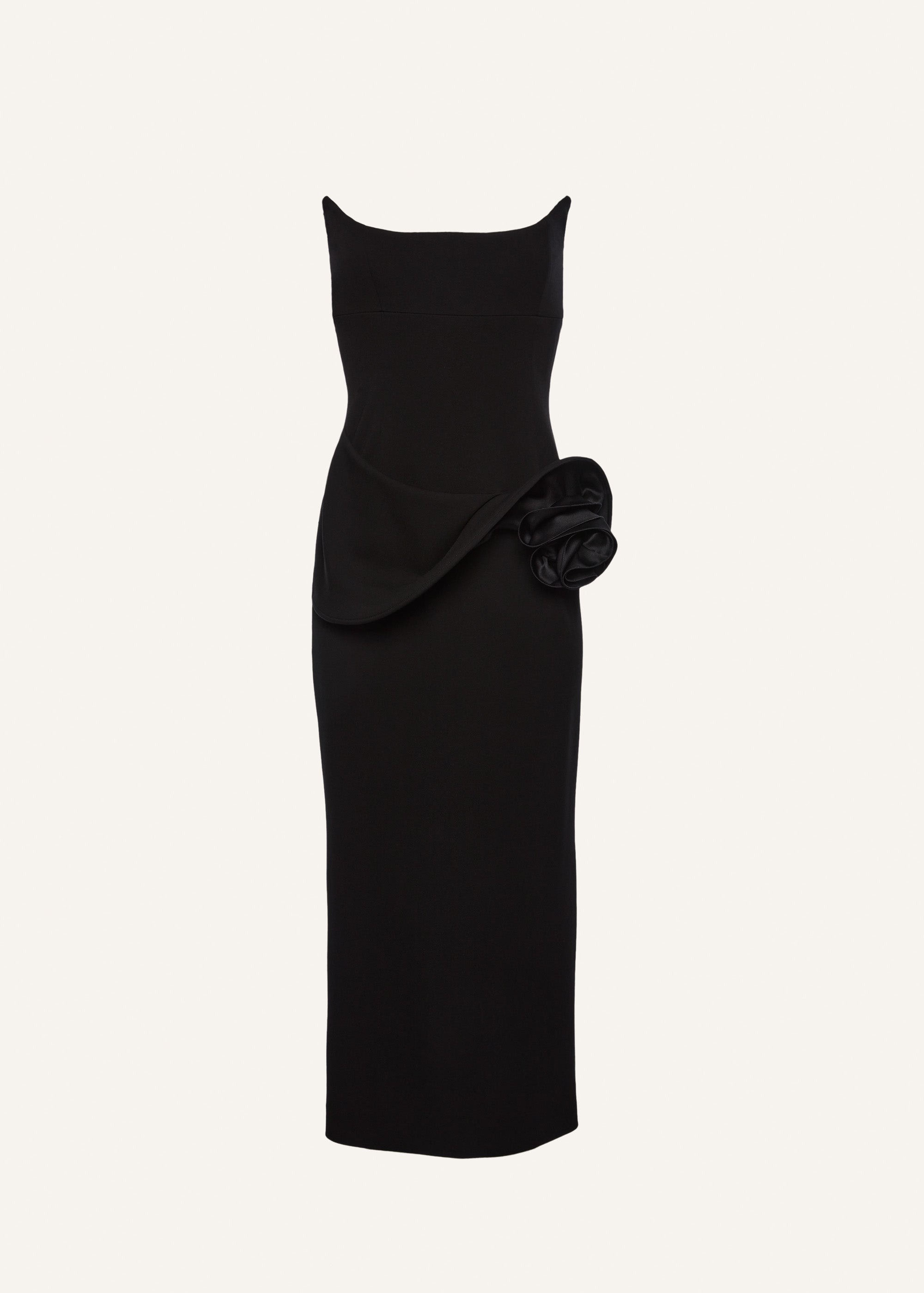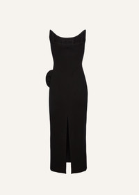 Black midi dress with a pointed-edge corset top, featuring Magda’s signature floral applique with a ruffle effect on the hip and a high back slit. Details ID: 105425 Shell 74% Viscose 22% Polyamide 4% Elastane. Lining 90% Silk 10% Elastane.100% Polyamide. Sizing This piece fits true to size. We recommend you get your regular size. Model is 180 cm and is wearing a size 34.