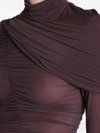 ruched cape-effect top Highlights - Wine red - Ruched detail - Long sleeves - High neck - Rear zip fastening Made in Italy Composition Cupro 92%, Elastane 8% Washing instructions Read Manufacturer Guidelines