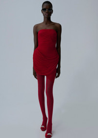 This strapless mini dress is richly ruched along the sides for a dramatic silhouette. The hip area is accentuated with exaggerated padding and additional draped overlays, creating an ultra-feminine shape. The bodice is elasticated for support and features an inner bodysuit for a secure fit. Details ID: 181925 Shell 92% Cupro 8% Elastane Sizing This piece fits true to size. We recommend you get your regular size. Model is 177 cm and is wearing a size 34.