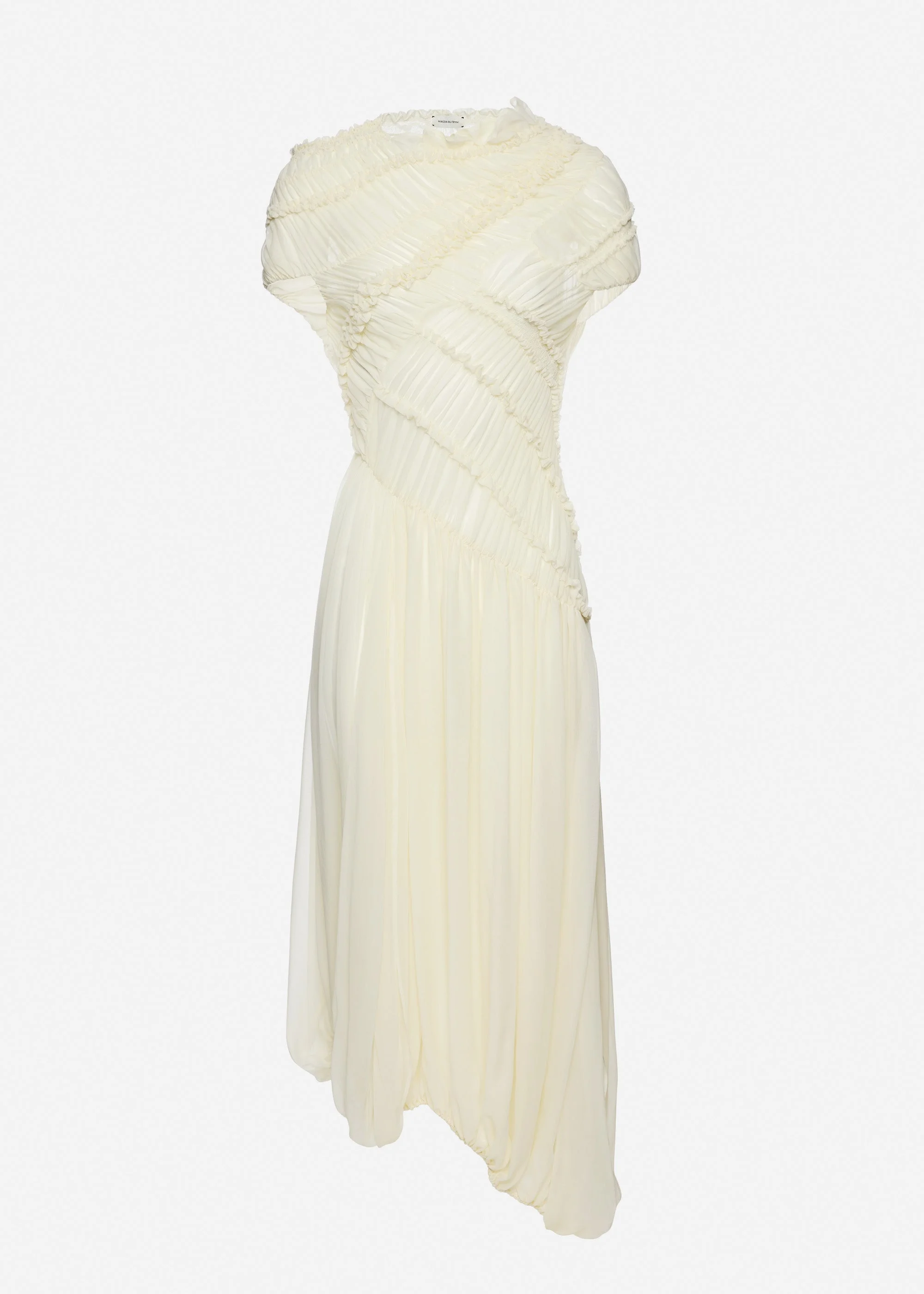Pre-order: expected to ship by March 30th 2026 A fluid silk muslin dress with short sleeves, designed with richly ruched panels sewn in multiple directions across the bodice. Featuring an asymmetric neckline and waist seam, and a gathered skirt that tapers into a softly draped hem. Comes with a separate bodysuit. Details ID: 133526 Shell 100% Silk Sizing This piece fits true to size. We recommend you get your regular size.