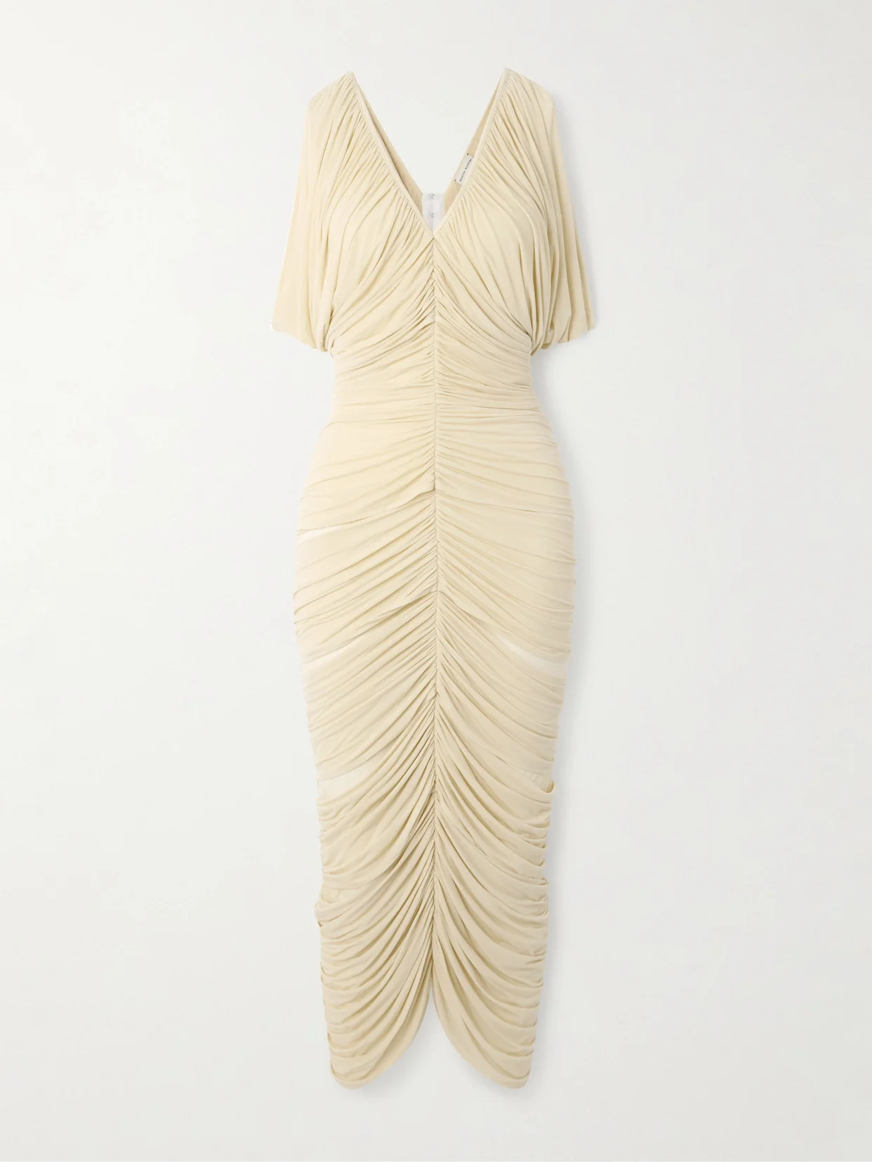 Magda Butrym's midi dress is ruched from shoulder to hem, so it beautifully accentuates your figure. It's made from comfortable stretch-jersey that's draped under the arms and has a sheer lining that peeks through along certain points of the skirt.