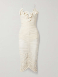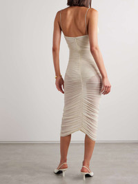 EDITORS'NOTES Magda Butrym's dress is underpinned with a built-in bodysuit that adds coverage to the otherwise sheer design. It's made from stretch-mesh that's intricately ruched throughout and has a ruffled neckline fitted with boning to keep its wavy shape. Complete your outfit with equally feminine accessories. SIZE & FIT Model measurements: - Fits true to size, take your normal size - Designed for a close fit - Built in bodysuit - Lightweight, stretchy fabric - Model is 177cm/ 5'10" and is wearing a FR 36 - Bust: 79cm/ 31" - Waist: 61cm/ 24" - Hip: 85cm/ 33.5" DETAILS & CARE - Ivory stretch-mesh - Concealed button and zip fastening at back, snap fastenings at base - 92% cupro, 8% elastane - Dry clean